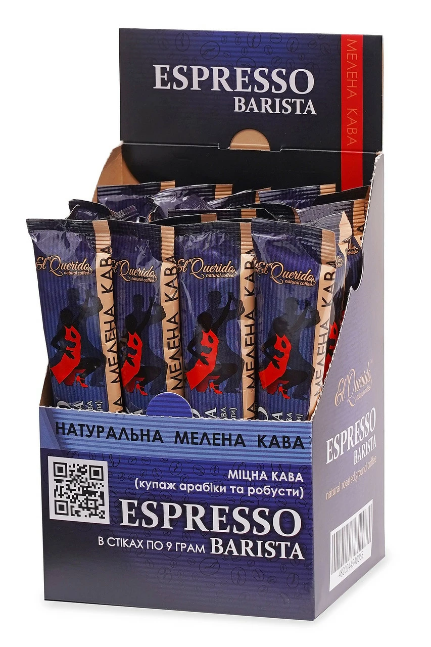 Кава мелена El Querido Espresso Barista 25 стіків в боксі по 9 г. Кава арабіка, робуста. Суміш з високоякісних сортів арабіки і