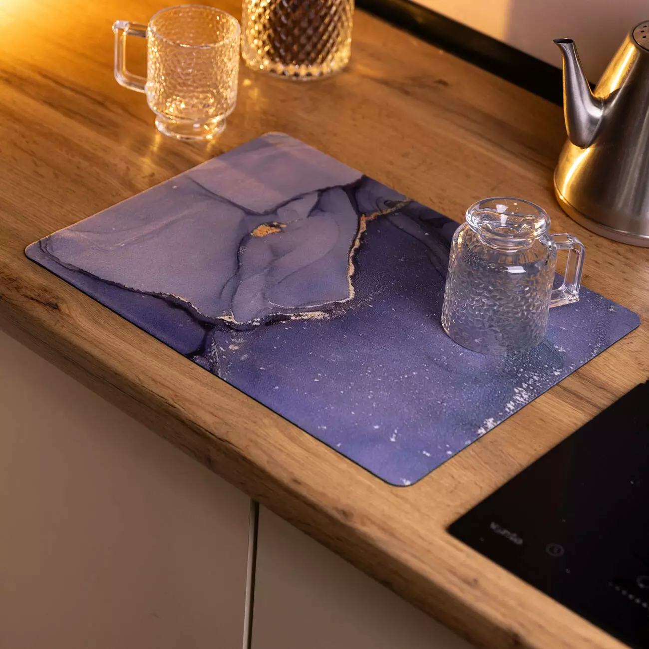 Декоративне оформлення килимка виконане у стилі fluid art: візерунок нагадує мінеральний зріз, а абстрактні потоки кольорів формують ефект мармурових прожилок. Такий дизайн виглядає стримано та водночас виразно, зберігаючи охайний вигляд під час щоденного використання. Килимок легко очищується — достатньо протерти поверхню вологою тканиною або промити водою.