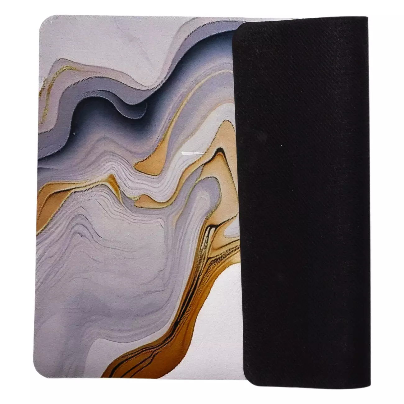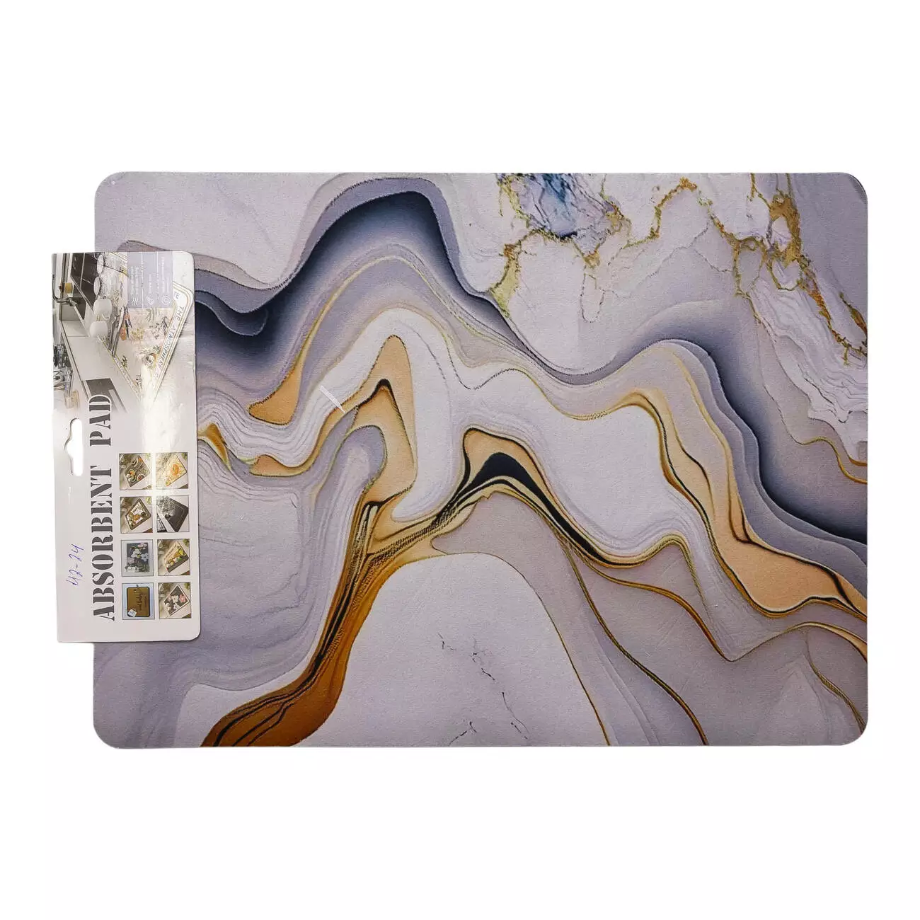 Декоративне оформлення килимка виконане у вигляді малюнка, що нагадує природний камінь. Візерунок складається з плавних хвилястих ліній і багатошарових переходів у відтінках білого, сірого та золотого. Колірні переливи створюють відчуття глибини та динаміки, а золоті акценти додають візуальної виразності, зберігаючи стриманий та охайний вигляд виробу. Килимок легко очищується — достатньо протерти поверхню вологою тканиною або промити водою.