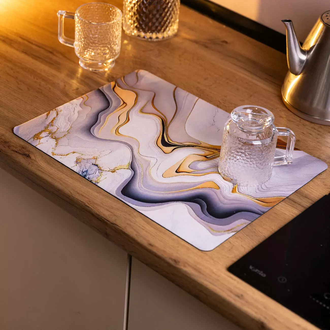 Килимок для сушіння посуду Marble Flow 40*30 см виготовлений із діатомітового матеріалу, який забезпечує ефективне вбирання вологи та швидке висихання посуду після миття. Вага 200 грамів робить килимок зручним у щоденному використанні та дозволяє легко розміщувати його на стільниці або біля мийки без перевантаження поверхні.