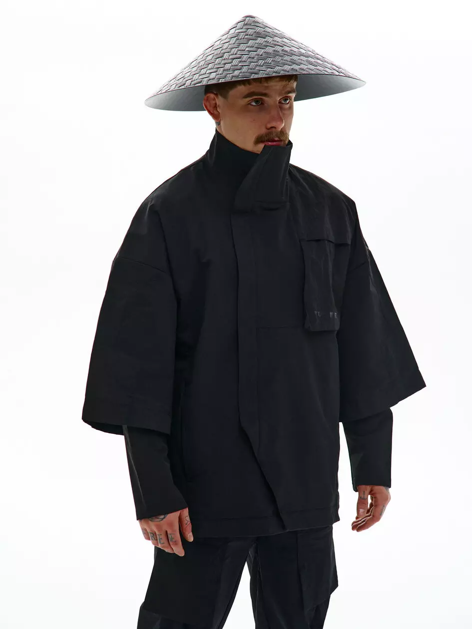 Кімоно з високим коміром-стійкою та асиметричним кроєм. На лівій