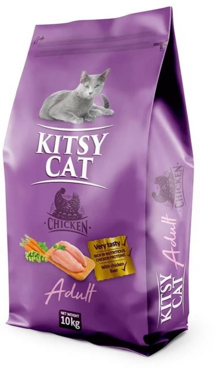 KITSY CAT полнорационный сухой корм для взрослых кошек всех пород с Курицей, премиум класс. Состав: Дегидратированное мясо курицы (35%), кукуруза, куриный жир (10%), дегидратированная куриная печень (5%), сушеное яблоко (0,1%), сушеная морковь (0,1%), сушеный горох (0,1%), розмарин (0,1%), петрушка (0,1%), шпинат (0,1%), сладкий красный перец, дрожжи и минеральные вещества. Витамины и минералы: Витамин А 15000 МЕ, Витамин D3 1500 МЕ, Витамин Е 30 мг, К-3 1 мг, В1 2 мг, В2 5 мг, В6 7 мг, В12 0,03 мг, Сапантотенат 10 мг, ниацин холин 20 мг 99 мг, фолиевая кислота 0,3 мг, витамин С 1000 мг, железо 100 мг, марганец 60 мг, медь 20 мг, цинк 100 мг, йод 1,5 мг, селен 0,15 мг; таурин 3000 мг. Аналитический состав: Белки 32%, Клетчатка 4%, Жиры 12%, Зола 9% Высокое содержание мясных компонентов (1-е место в составе + дегидратированное мясо) Не содержат пшеницы и сои Натуральные антиоксиданты, консерванты Низкая суточная норма кормления Энергетическая ценность: 3850 ккал/кг. Производитель- Сербия