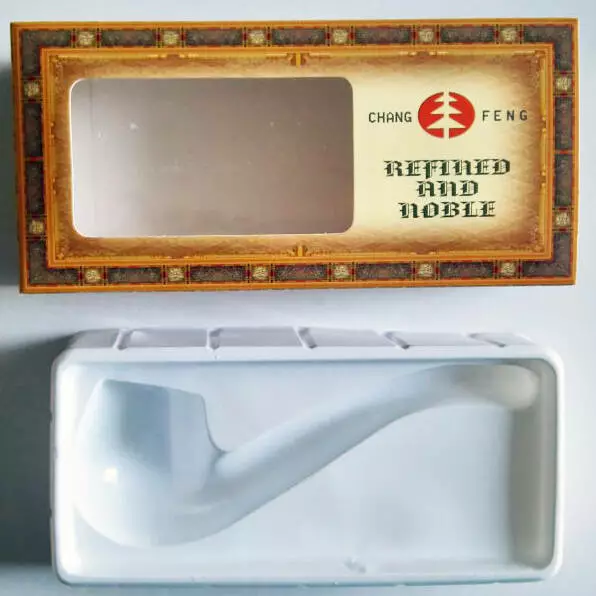 Классическая курительная трубка CHANG FENG с изящным дизайном и разборной конструкцией. Чаша выполнена в благородном древесном оттенке с металлическим ободком, а изогнутый чёрный мундштук обеспечивает удобство использования. Трубка представлена на деревянной подставке с фирменной гравировкой, что подчёркивает её стиль и практичность.