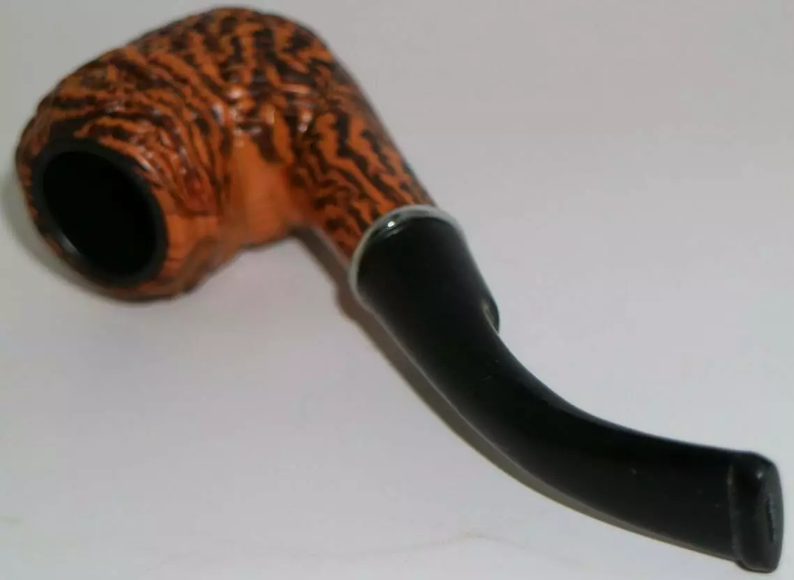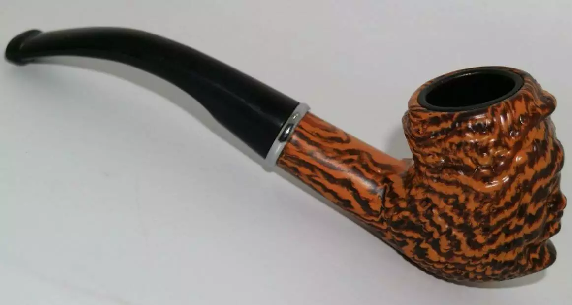 Классическая курительная трубка с фактурной поверхностью под дерево. Чаша выполнена в коричнево-рыжем оттенке с рельефным узором, устойчивым к высоким температурам, и оснащена металлической вставкой внутри для удобства и долговечности. Изогнутый чёрный мундштук с хромированным кольцом обеспечивает комфортное использование.