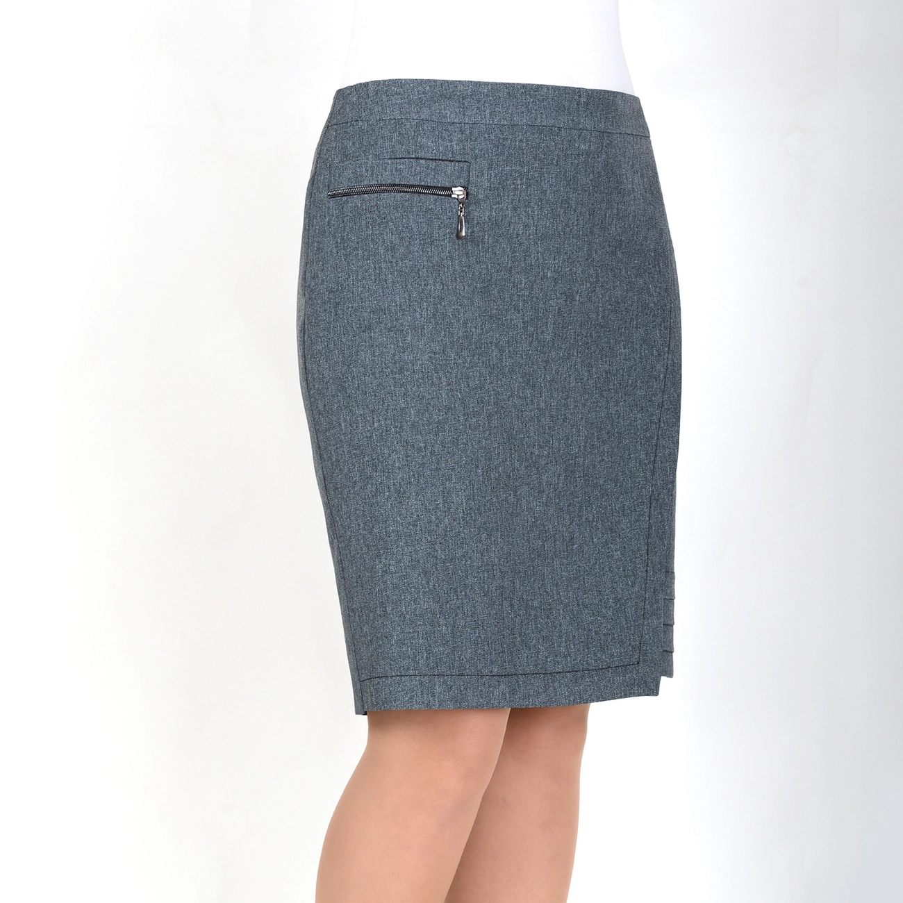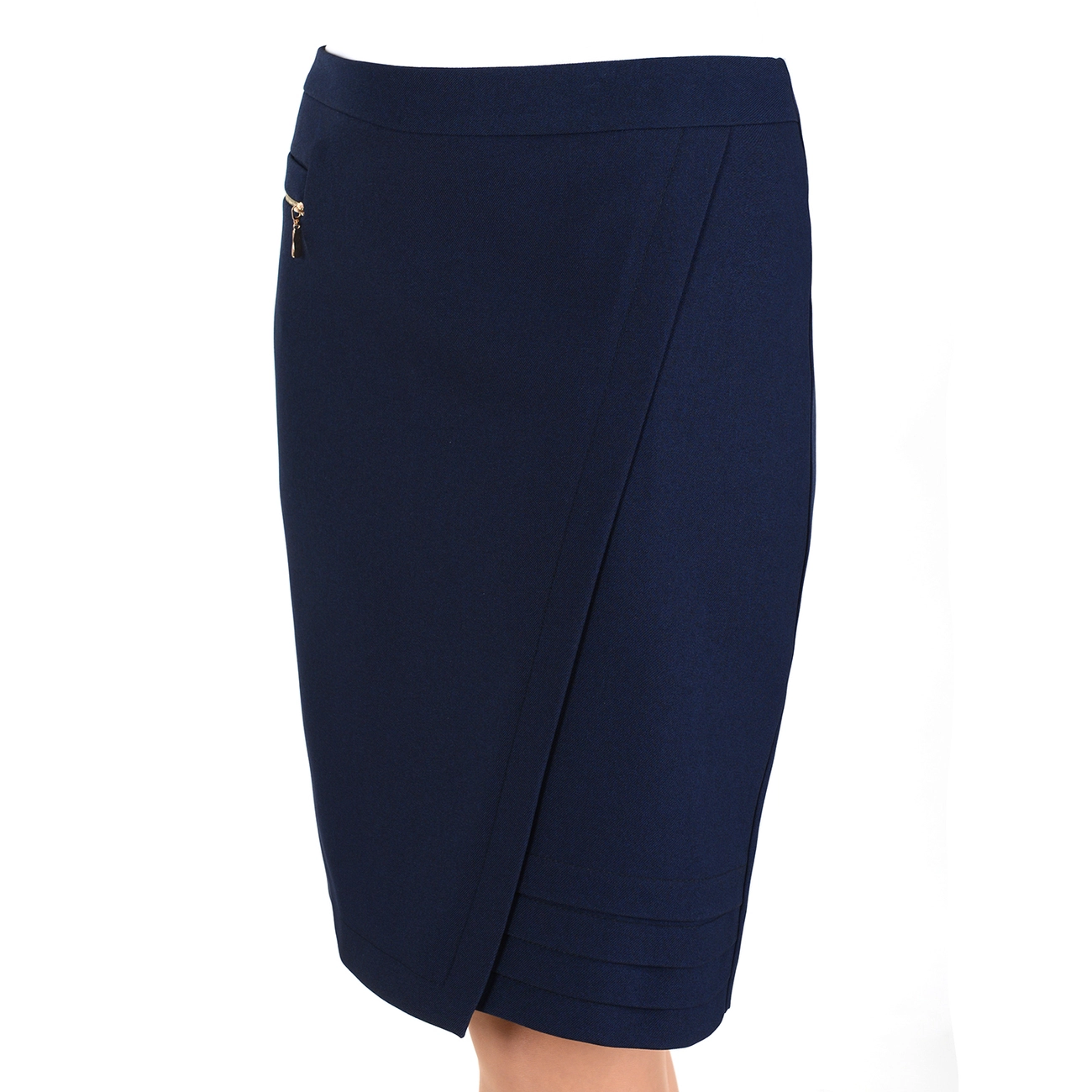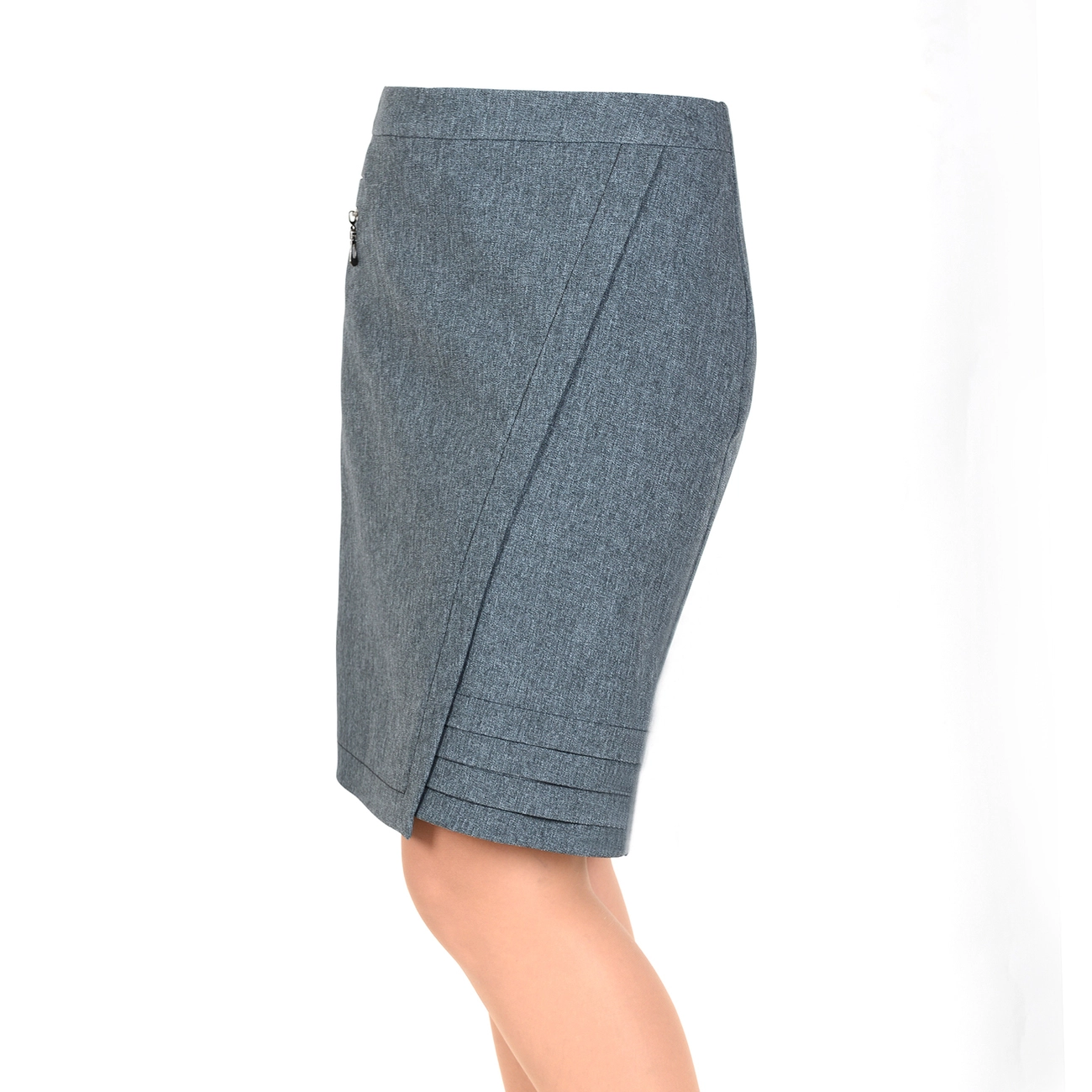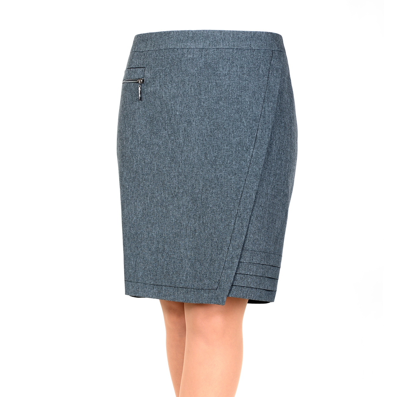 Классическая юбка с эффектом запаха, дополнена декоративными элементами в виде молнии и защипов. |