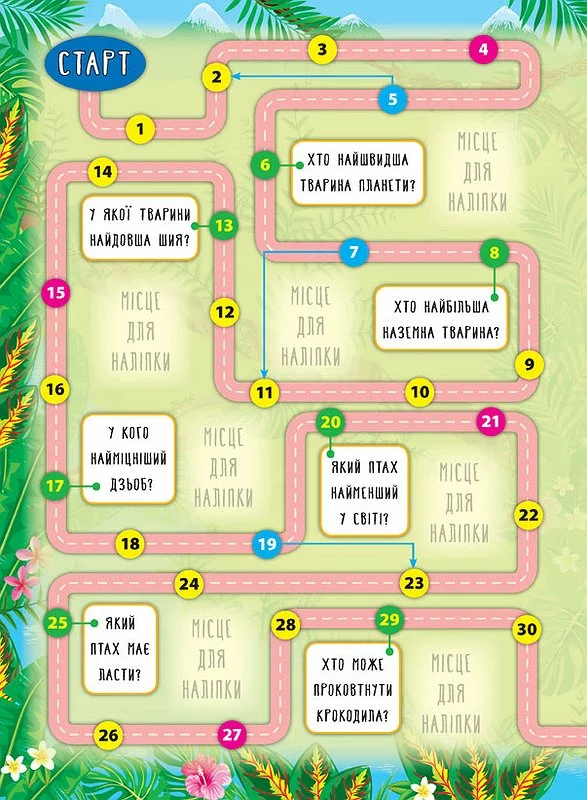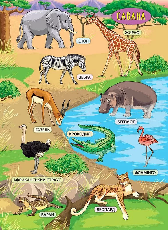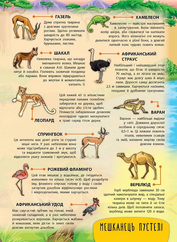 Це видання познайомить дитину з тваринами різних куточків світу — мешканцями пустелі, савани, джунглів, Південного та Північного полярних кіл. У кінці книги малюк знайде захопливу настільну гру, що допоможе весело провести час із друзями, закріпити здобуті знання та пограти з яскравими наліпками, що містяться у виданні.