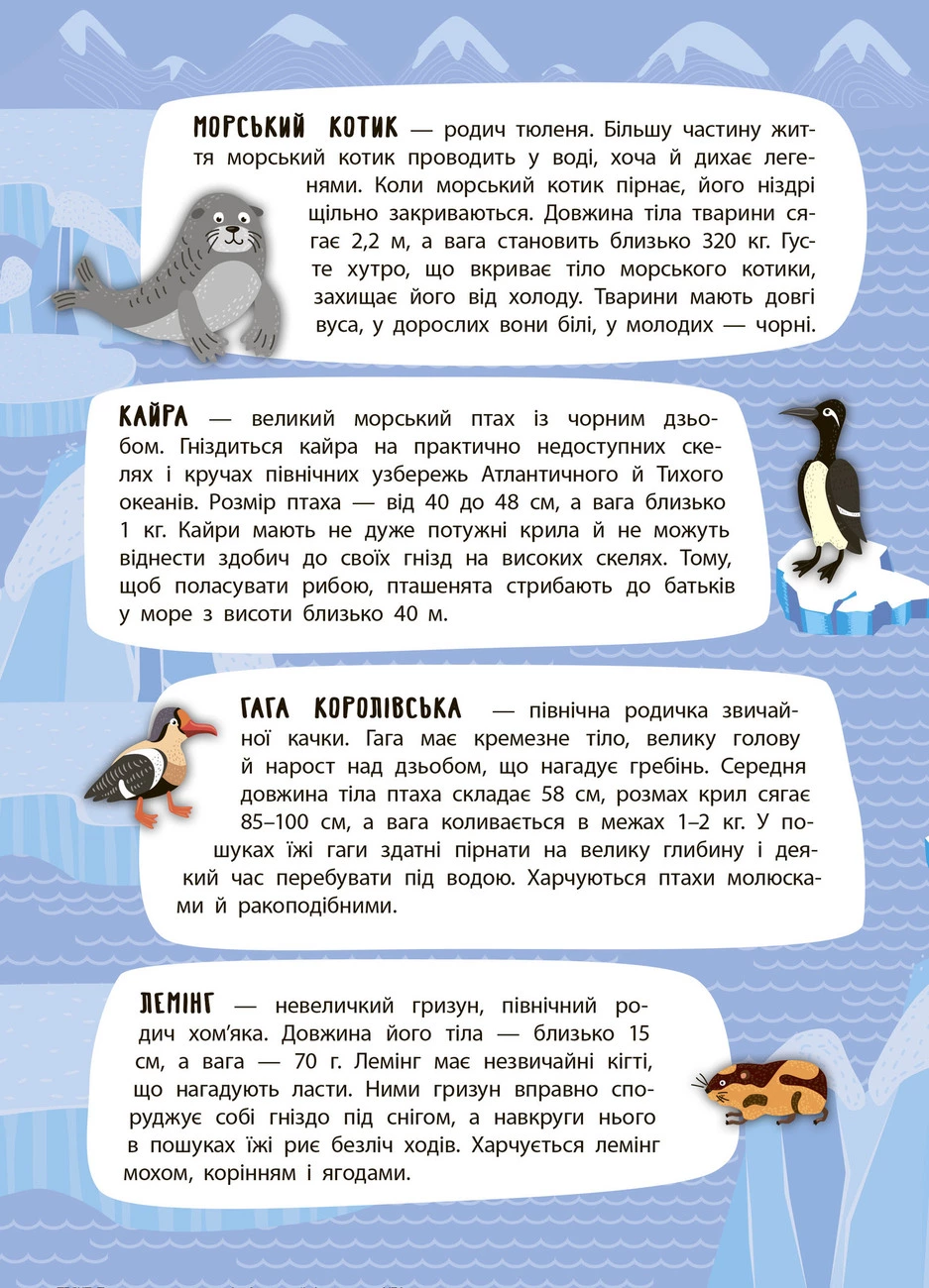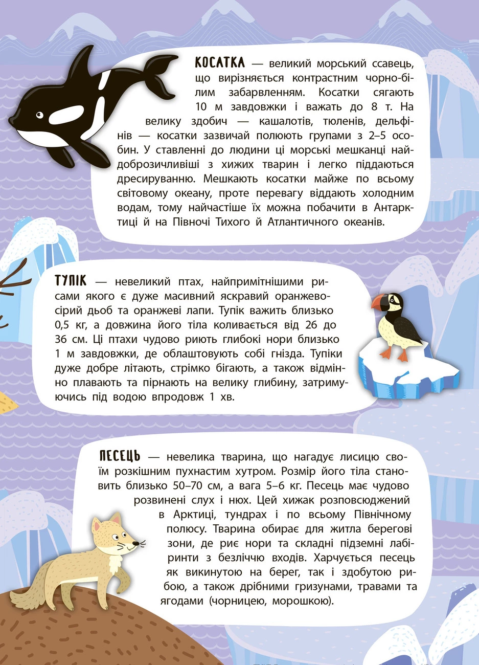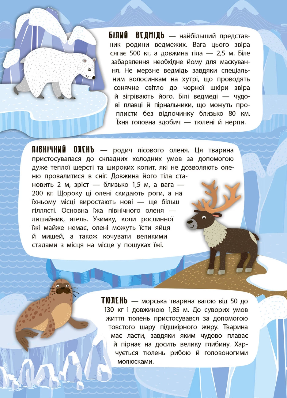 Ця книжка познайомить малюків з тваринним світом Арктики й Антарктики. Видання розширить кругозір дитини, допоможе розвинути творче мислення, фантазію та кмітливість, а також покращить дрібну моторику пальців рук, що сприятиме вдосконаленню мовлення. Велика панорамна ілюстрація, кольорові наліпки та безліч цікавої тематичної інформації гарантують вам захопливе й пізнавальне дозвілля!
