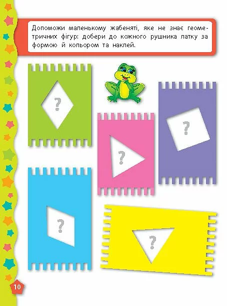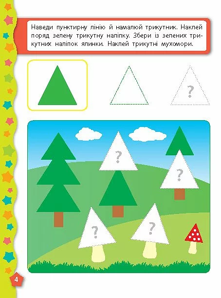 Ця книга познайомить вашу дитину з основними геометричними фігурами, такими як квадрат, трикутник, коло, прямокутник, ромб, овал та трапеція. Виконуючи захопливі завдання, малюк запам’ятає назви фігур, навчиться впізнавати їх на малюнку та серед інших предметів, розрізняти за формою, розміром та кольором. Видання призначене для спільної роботи дорослих з дітьми дошкільного віку.