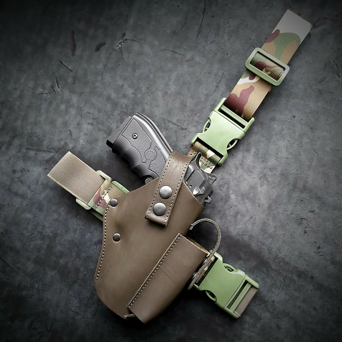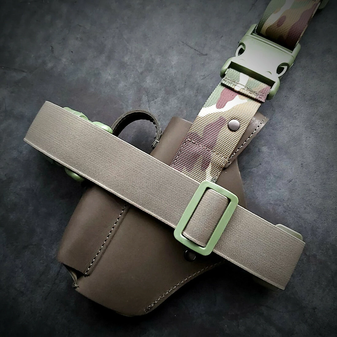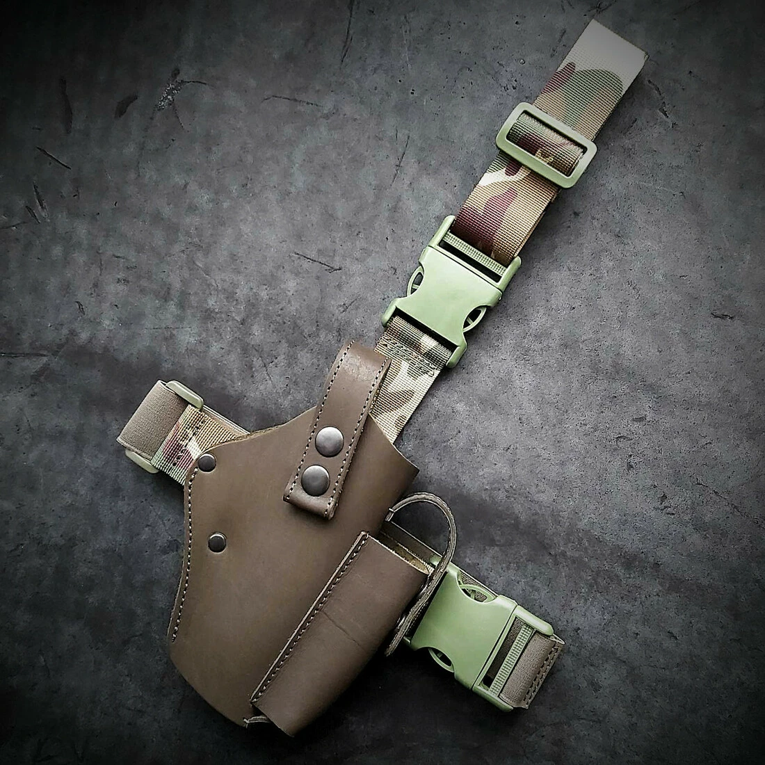 Пістолет та магазин фіксуються на кнопках. Кріпиться на стегно за допомогою стропи згори, гумки збоку. Регулюється за висотою та шириною. Фастекси, стропа, гумка міцні.