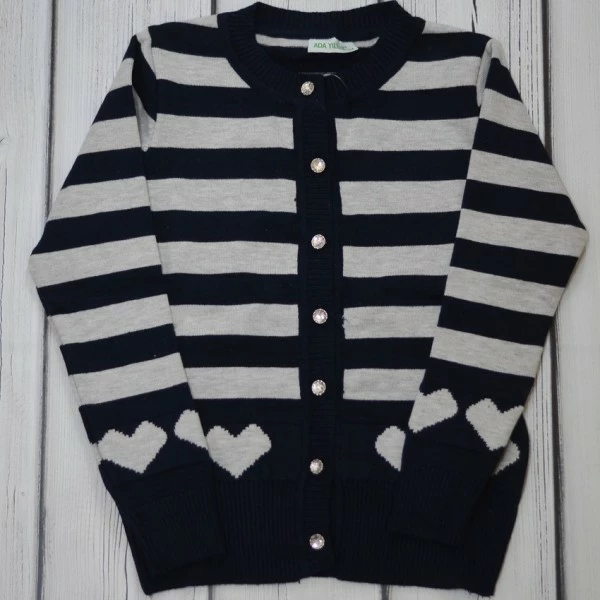 Основное полотно кофты выполнено гладкой машинной вязкой в виде полос белого и синего цвета, а также сердечек в нижней части переда и рукавов. Верхний и нижний бортик кофты соединяются при помощи петлевых пуговиц-стразов и выполнены машинной вязкой «резинка». К заказу в интернет-магазине L'CarouseL доступны модели для девочек 6-9 лет.