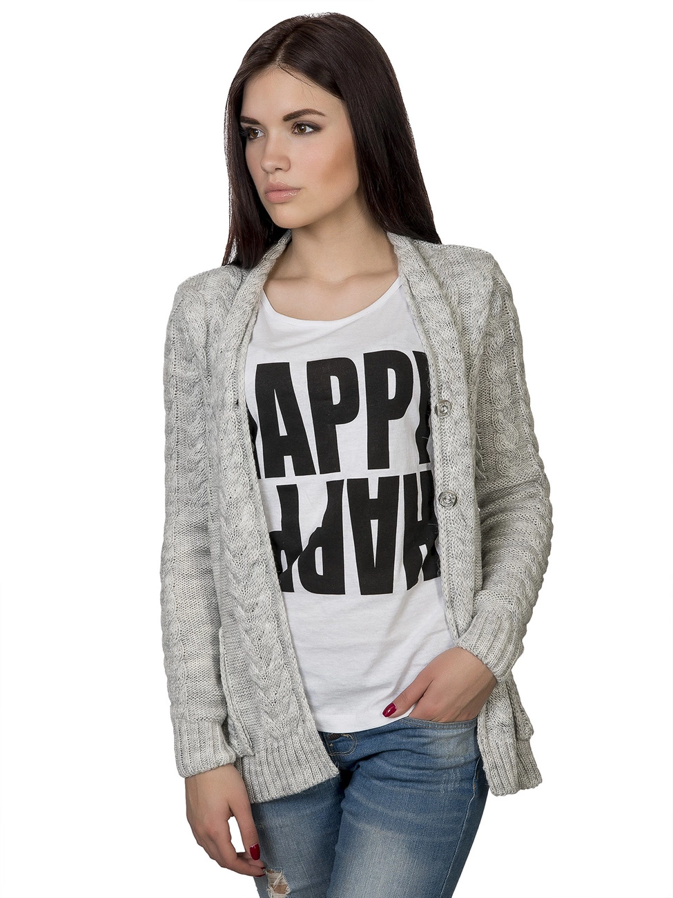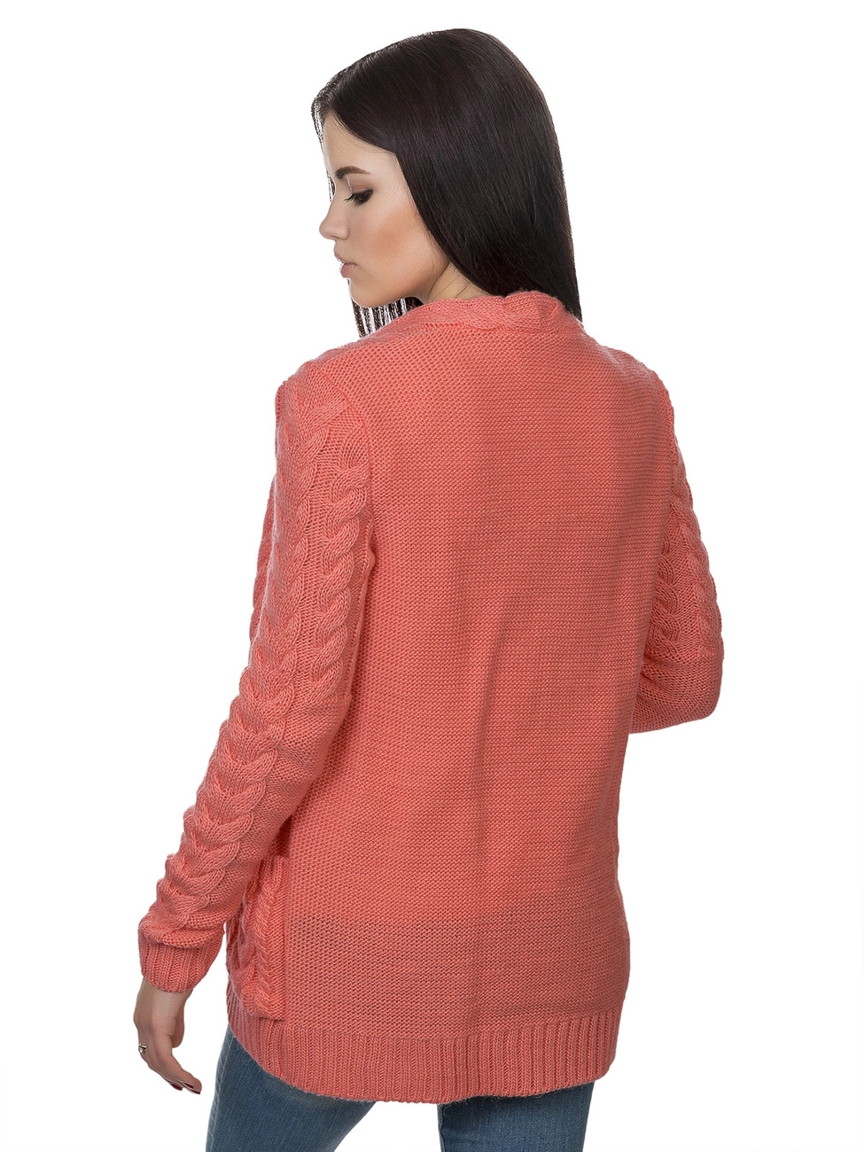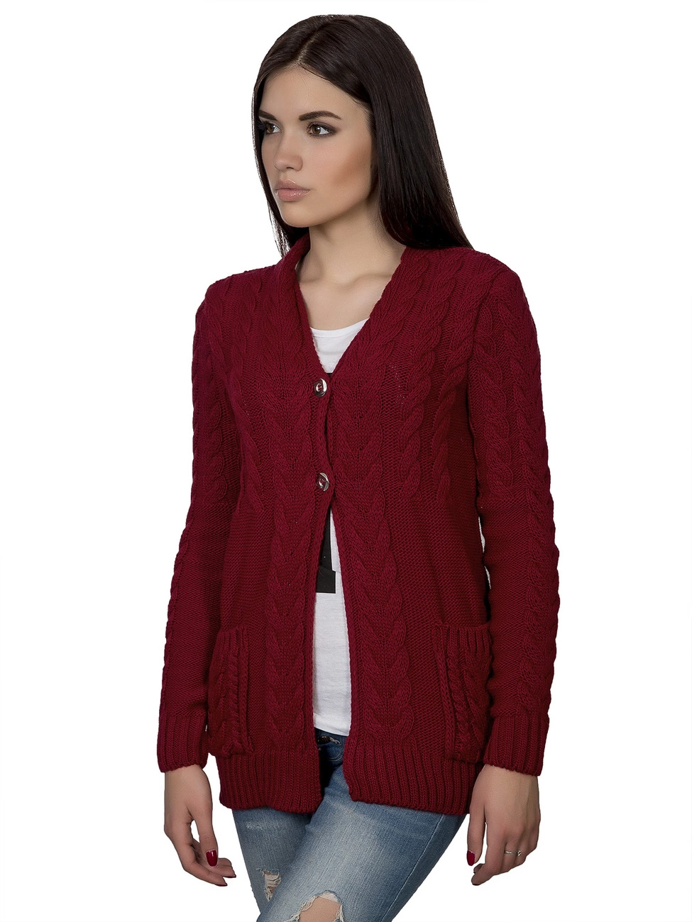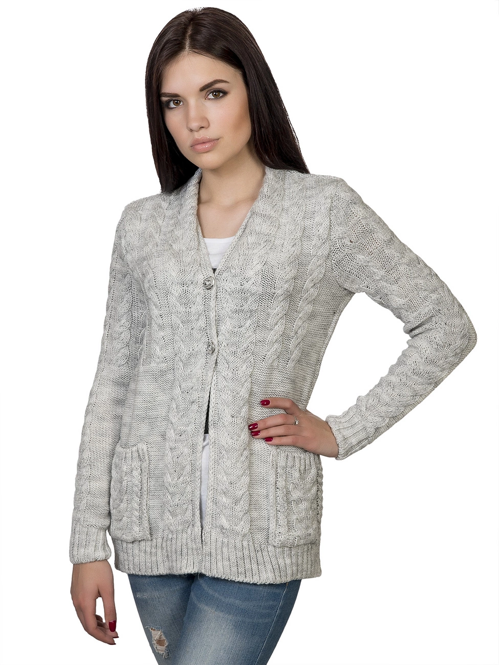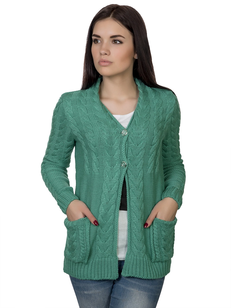 Теплая, элегантная вязаная кофта, прямого силуэта, круглый вырез горловины. Выполнена из мягкой, приятной на ощупь пряжи, дополнена фактурным рисунком с косами. По бокам на кофте карманы, впереди застежка на две пуговицы. Представленный наряд легко станет незаменимым в Вашем гардеробе!