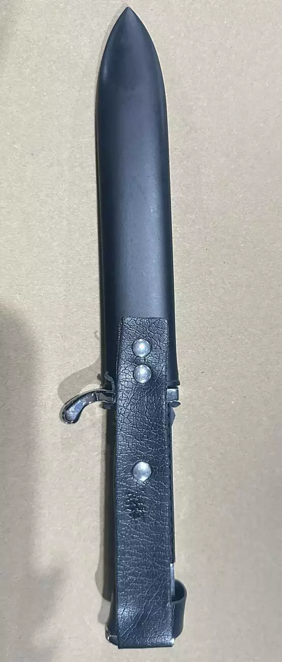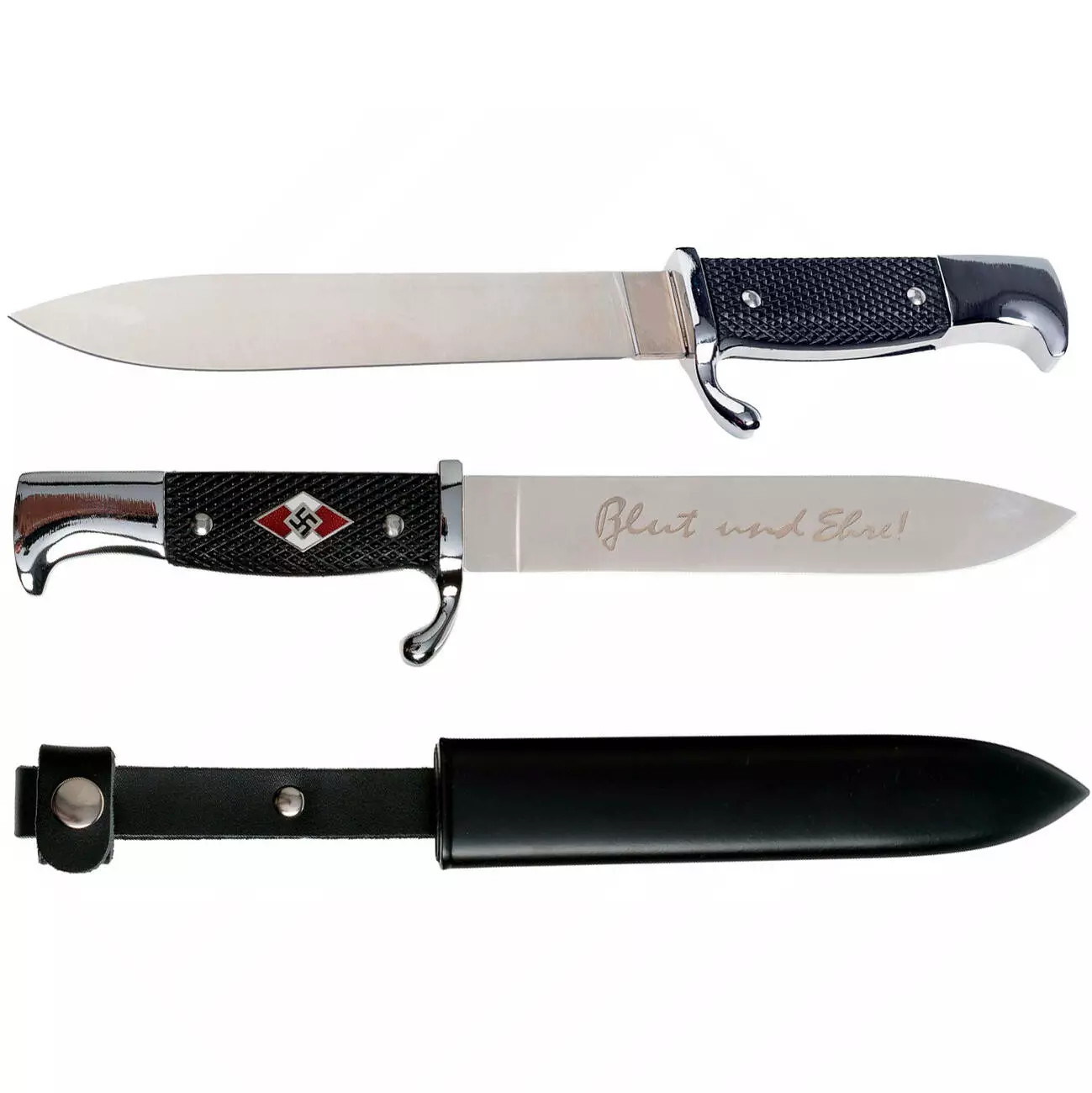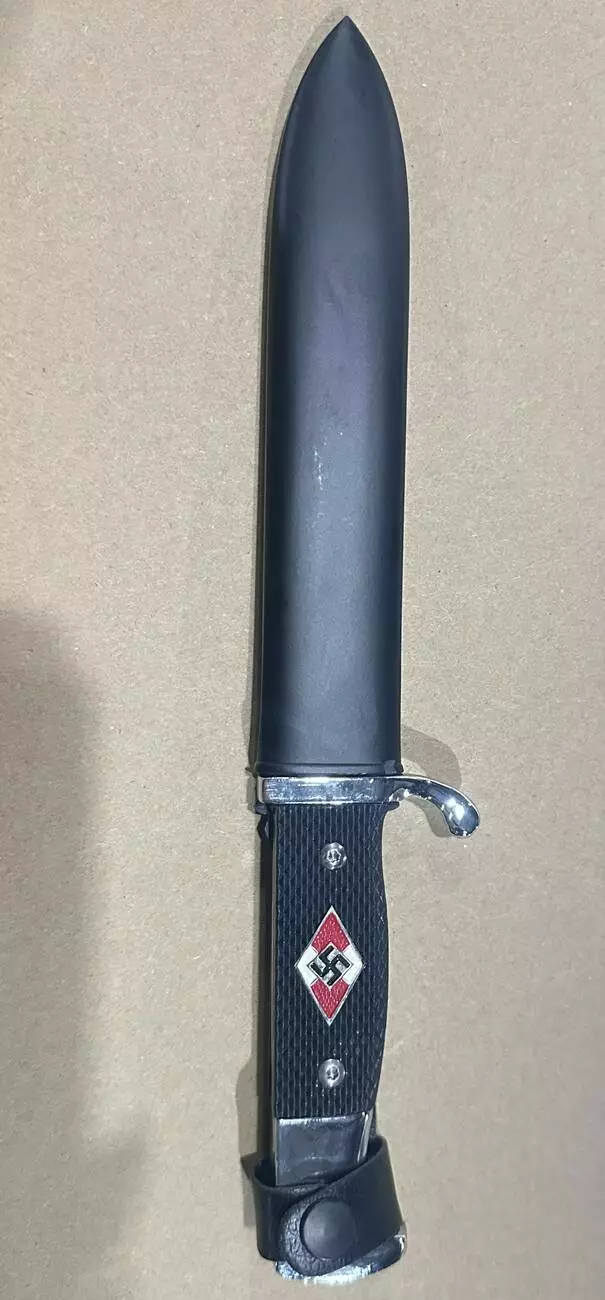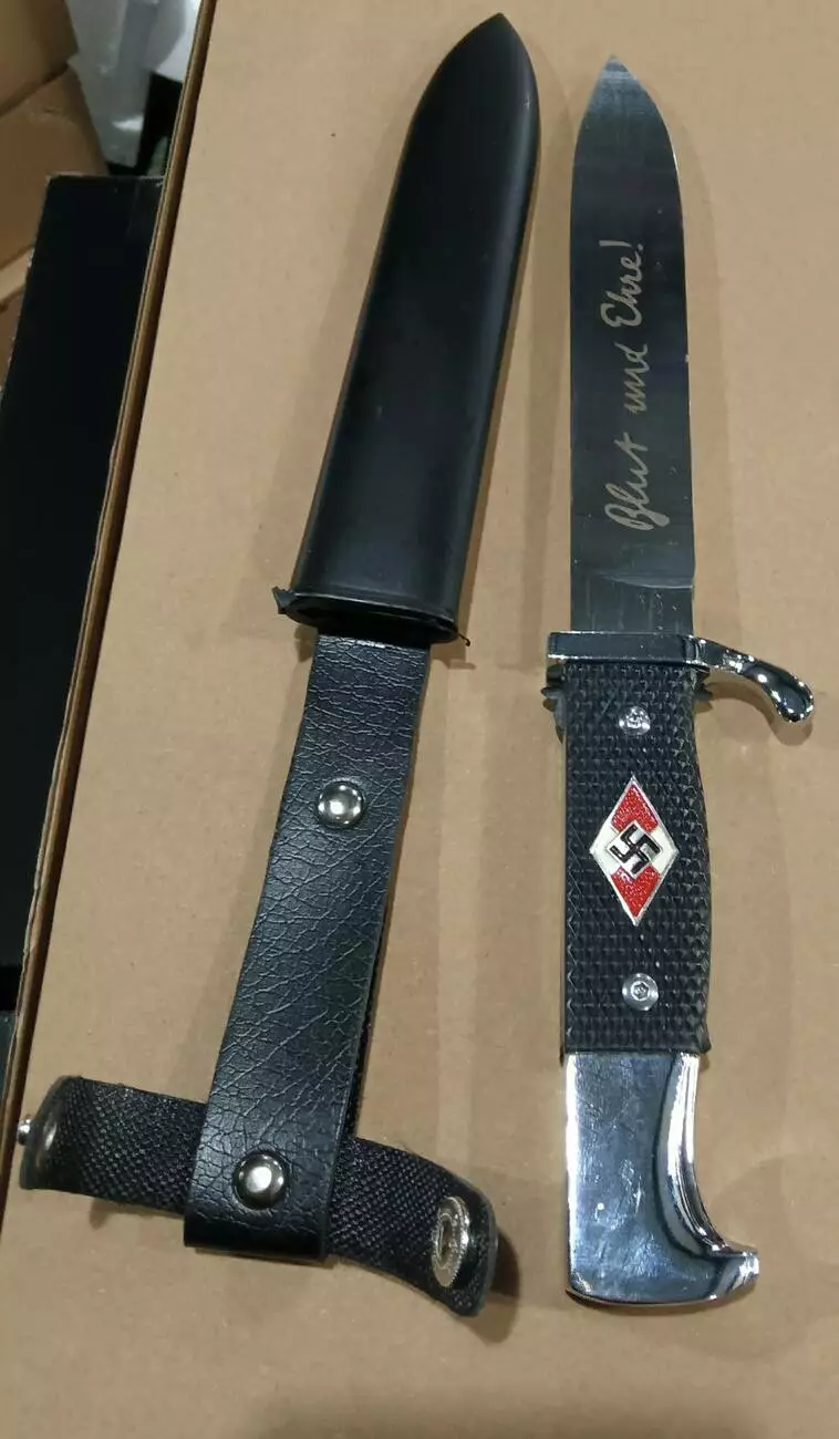Этот декоративный нож является стилизованной репликой исторического оружия, впервые представленного в 1933 году. Его форма напоминает штыки, использовавшиеся в Вермахте и других военизированных структурах, и он предназначался в качестве дополнительного оружия. Клинок изготовлен из нержавеющей стали и украшен гравировкой "Blut und Ehre!" (в переводе "Кровь и честь!"). Рукоять имеет текстурированное покрытие для удобного хвата. В комплект входят прочные кожаные ножны с креплением для ремня.