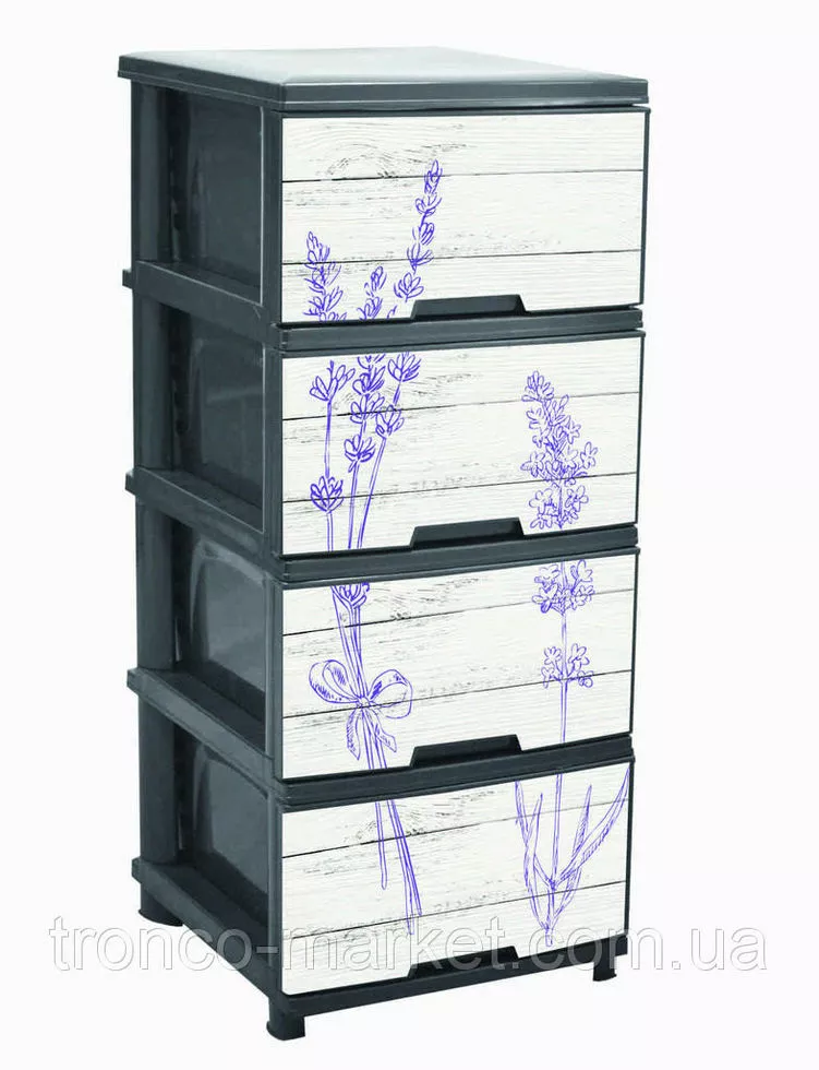 Новинка от украинского производителя АЛЕАНА - комод на четыре ящика с декором. Комод (фр. commode — «удобный») — предмет французской мебели с выдвижными ящиками для хранения одежды. Разработан с целью помочь вам грамотно организовать хранение вещей в вашем доме. ?зготовлен из качественного полипропилена, удобный и вместительный. ?спользуется как дополнение к основной мебели и к туалетному столику. В нем можно хранить хранить ювелирные украшения, косметику и другие необходимые вещи. Оптимально подобранный размер : высота 95,5 см, ширина 39,5 см, глубина 46,5 см , разнообразный декор и изысканные цвета на любой, даже самый требовательный вкус с легкостью впишется в любой интерьер. Для любителей классики подойдет - Ротанг или Дерево, для романтических натур - Париж или Лаванда, для маленьких девочек - Совы, Медведи,Девочки, для мальчиков -Ралли,Совы, Медведи. Каждыйнайдет для себя красивый дизайн. Правильно организованное хранение,при этом еще и радущее глаз гарантирует порядок в доме и в мыслях. Проверьте на себе! :)