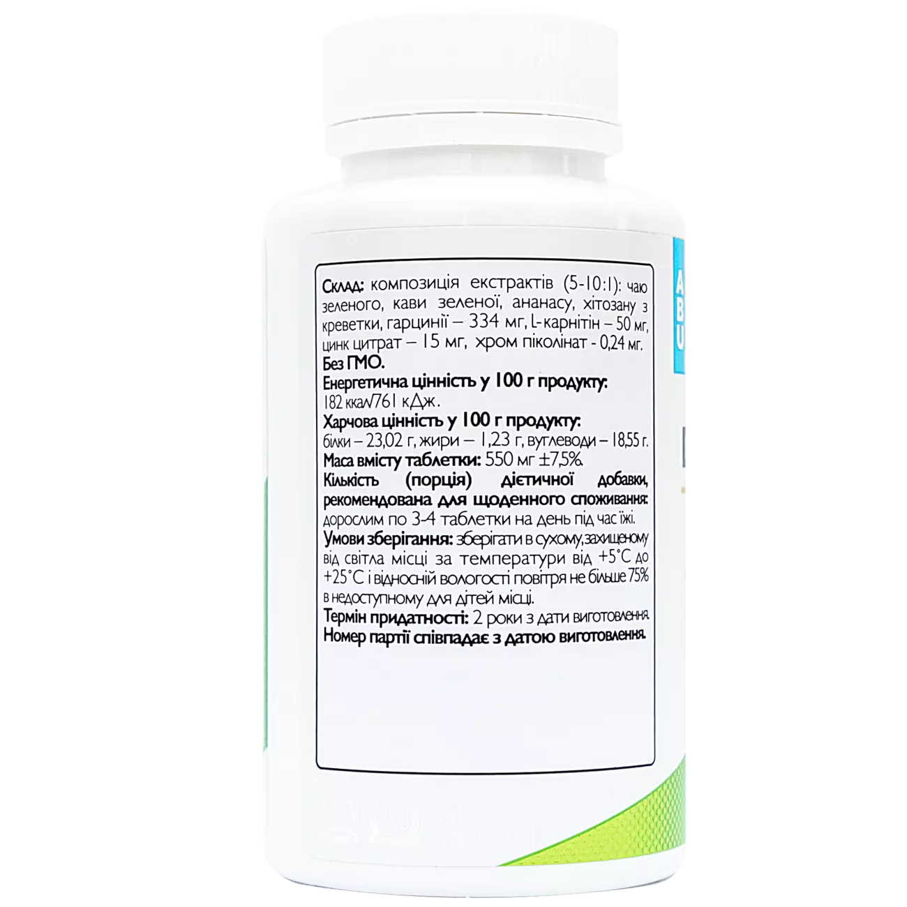 Композиція екстрактів (5-10:1): чаю зеленого, кави зеленої, ананасу, хітозану з креветки, гарцинії – 334 мг, l-карнітин – 50 мг, цинк цитрат – 15 мг, хром піколінат – 0,240 мг.