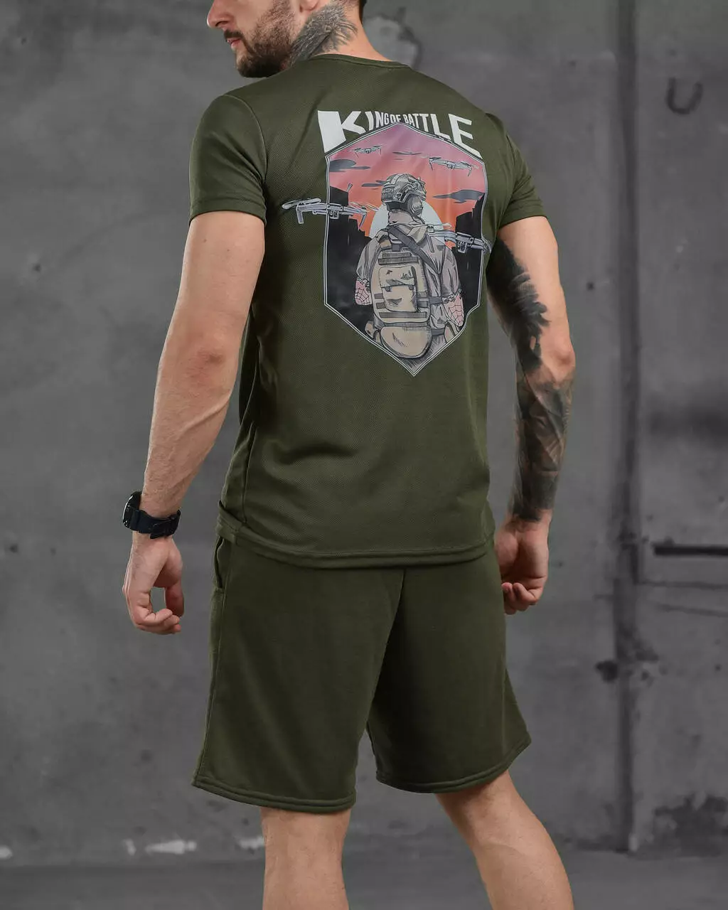 Підготуйтеся до літа з нашим стильним чоловічим комплектом, що містить комфортні шорти та футболку. Шорти виготовлені з легкого дихаючого матеріалу, який ідеально підходить для активного способу життя. У них зручний пояс на зав'язках для ідеальної посадки. Футболка виготовлена з поліестеру, що забезпечує еластичність і комфорт. Вона має стильний принт на грудях і чудово поєднується із шортами.
