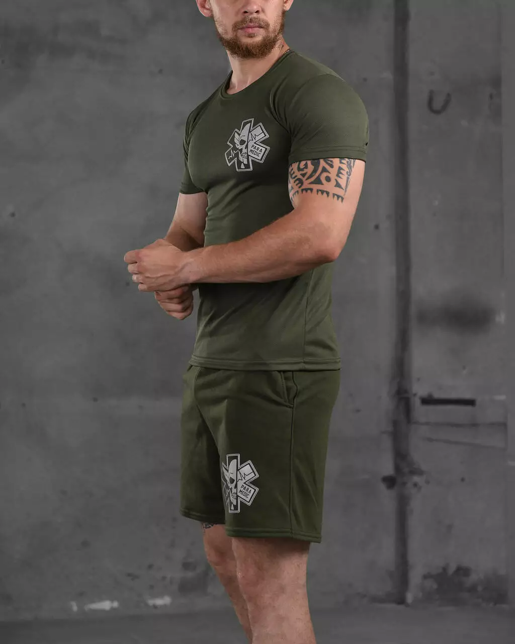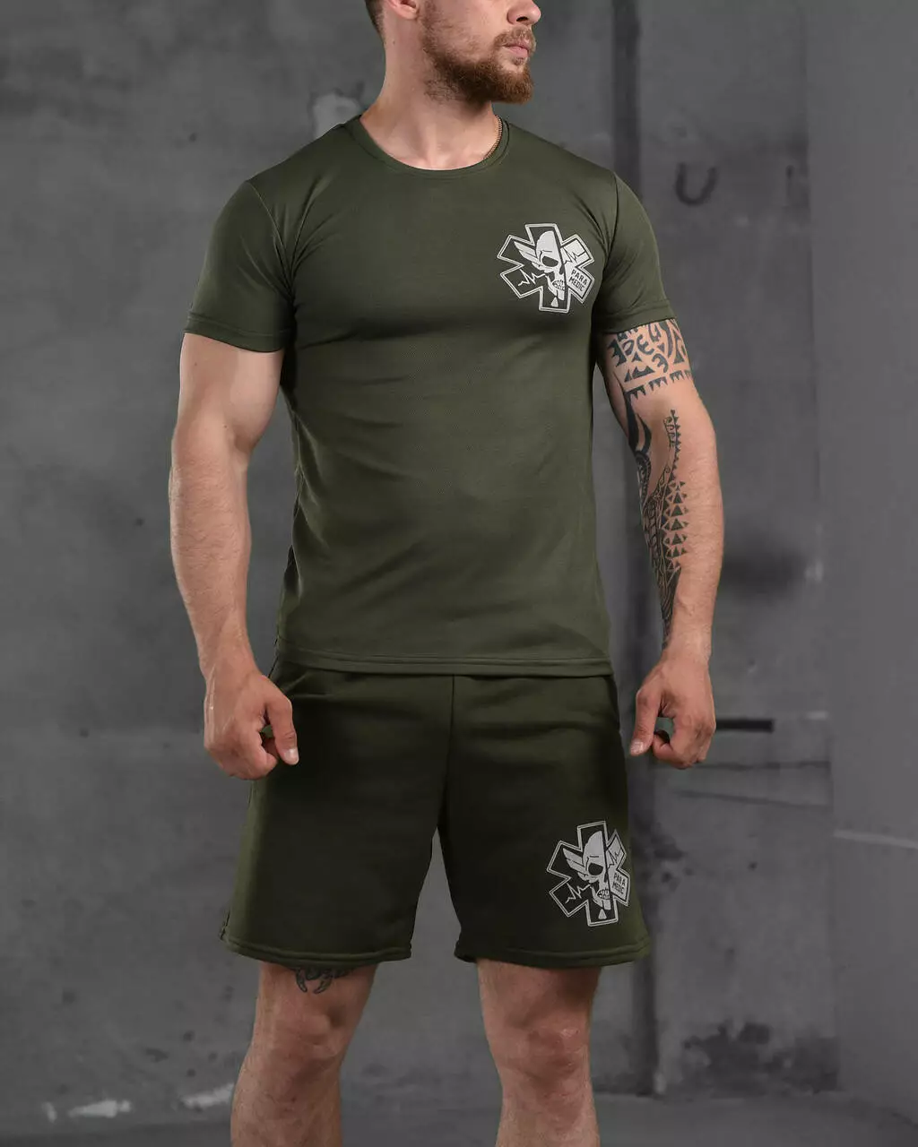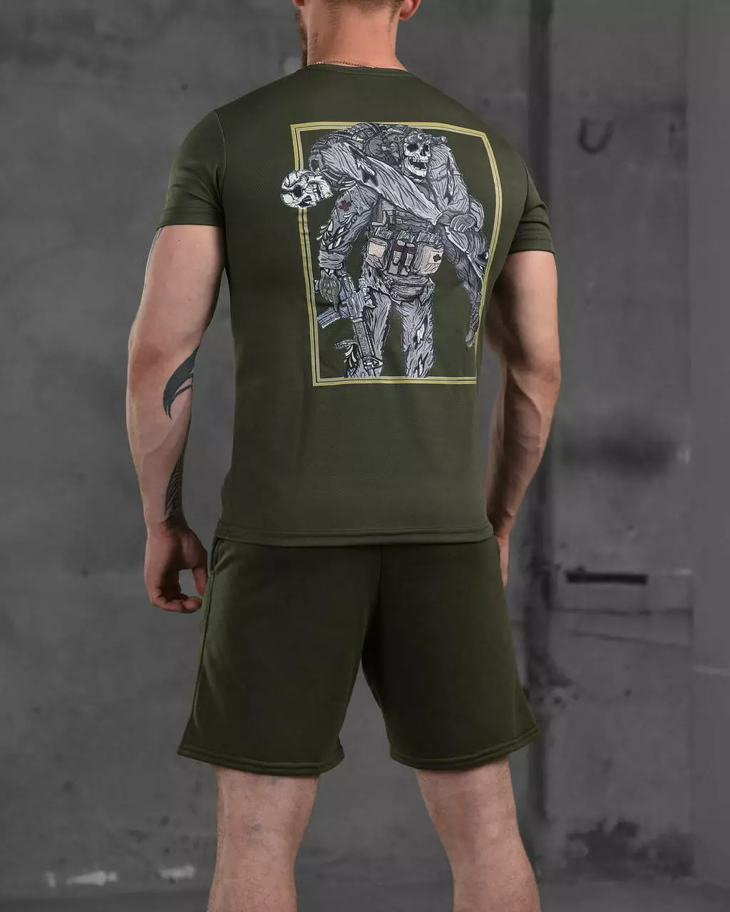 Підготуйтеся до літа з нашим стильним чоловічим комплектом, що містить комфортні шорти та футболку. Шорти виготовлені з легкого дихаючого матеріалу, який ідеально підходить для активного способу життя. У них зручний пояс на зав'язках для ідеальної посадки. Футболка виготовлена з поліестеру, що забезпечує еластичність і комфорт. Вона має стильний принт на грудях і чудово поєднується із шортами.
