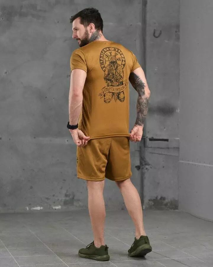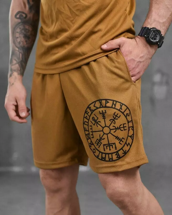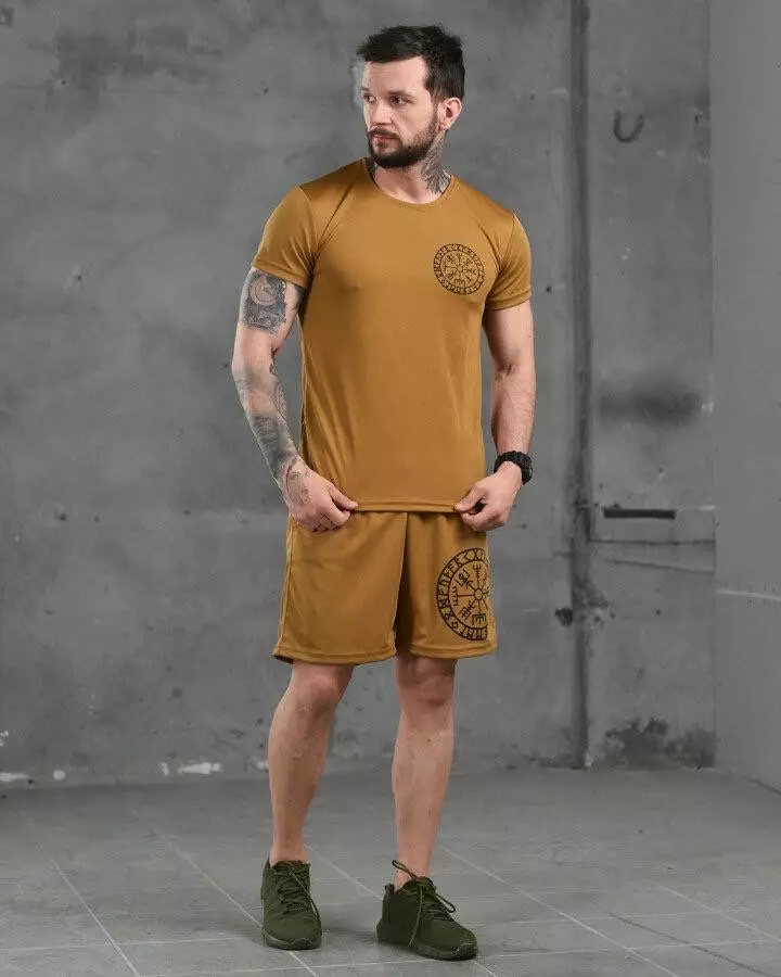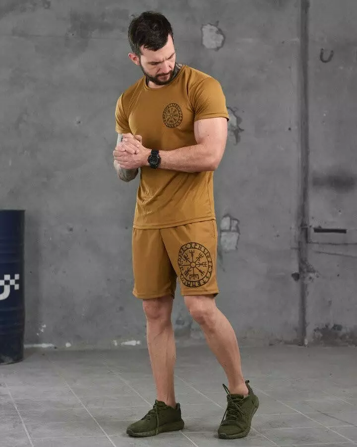 Підготуйтеся до літа з нашим стильним чоловічим комплектом, що містить комфортні шорти та футболку. Шорти виготовлені з легкого дихаючого матеріалу, який ідеально підходить для активного способу життя. У них зручний пояс на зав'язках для ідеальної посадки. Футболка виготовлена з поліестеру, що забезпечує еластичність і комфорт. Вона має стильний принт на грудях і чудово поєднується із шортами.
