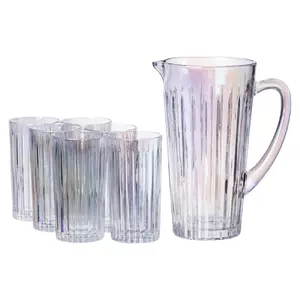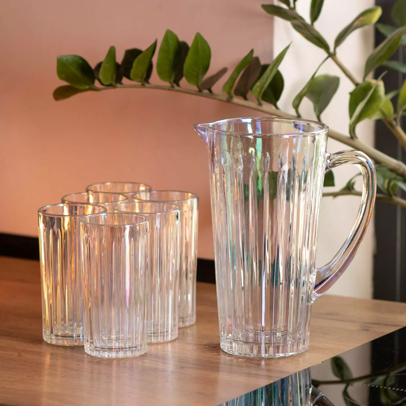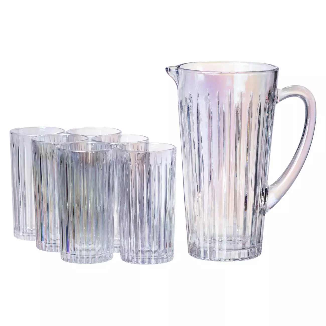 Набір Glass Elegance створений для щоденного використання вдома або на невеликих заходах. До його складу входить прозорий скляний глечик з рельєфним вертикальним візерунком та шість склянок, виконаних у такому ж стилі. Всі елементи вироблені зі скла, яке легко миється та не вбирає запахи.