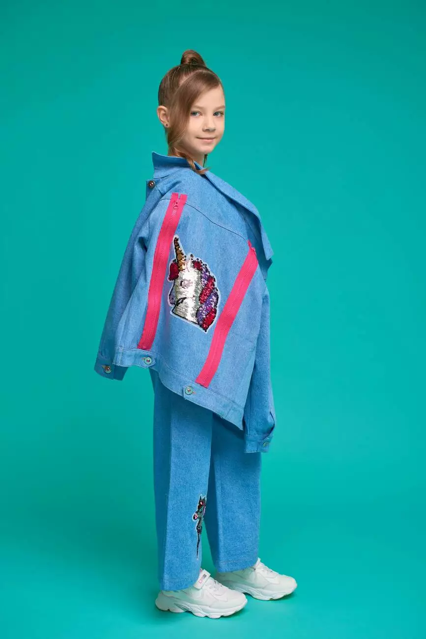 Низ: джинси світло-блакитного кольору. Середня посадка. Штанини злегка розширені до низу, з фігурними накладними кишенями по переду та аплікацією з двосторонніх паєток у вигляді Єдинорога. Середня посадка. Застібка на блискавці. В пояс по спинці вставлена ​​резинка, на пояс нашиті шльовки. Ззаду штанів кокетка, відстрочена по шву обробною ниткою. Також, обробною ниткою відстрочені всі шви джинсів.