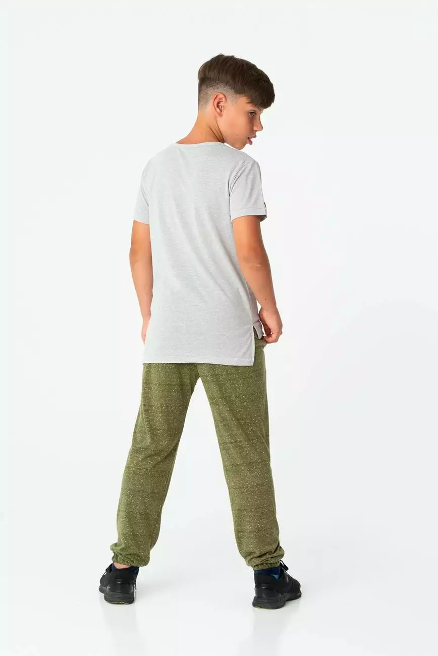 Склад: 20% бавовна, 80% поліестер Низ: Основний колір - хакі (зелений). Штани напівприлягаючого силуету зі зміщеними бічними швами. Є дві бічні кишені. У поясі і по низу брюк вставлена резинка. Без декору.