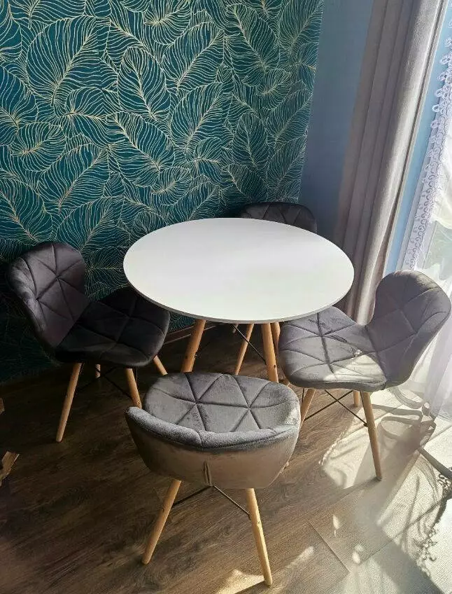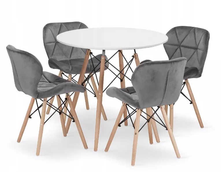 Цей набір поєднує елегантний білий круглий стіл і 4 сірі бархатні