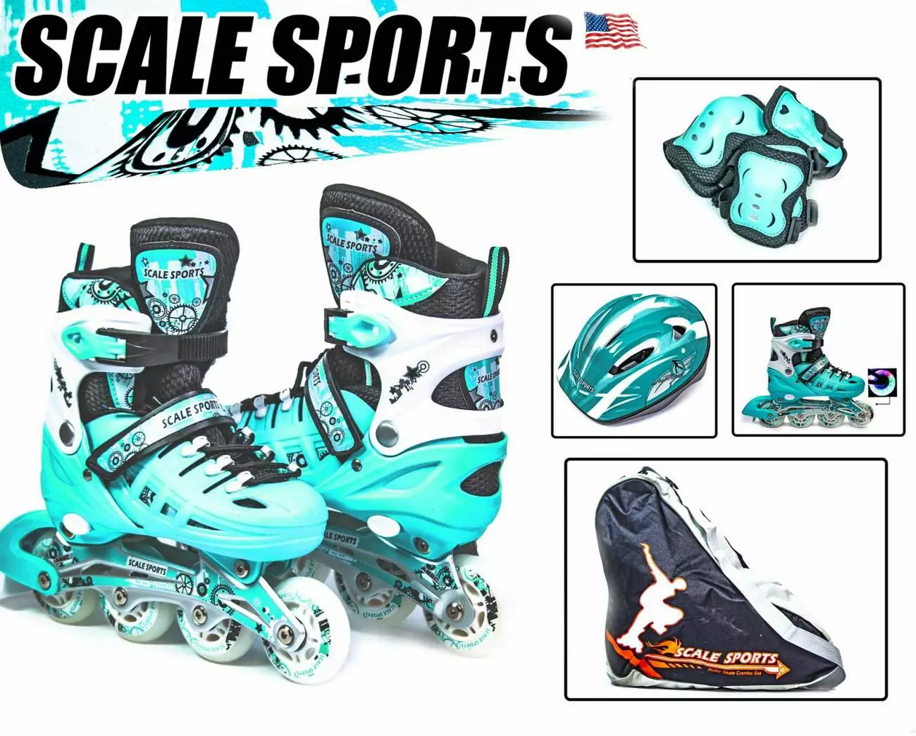 <p>Комплект<strong> "Scale </strong>Sports<strong>"  </strong>предназначены для тех, кто любит качество и надежность. Покупая комплекты<strong> "Scale </strong>Sports<strong>" </strong>, вы одновременно получаете сразу целый набор всех необходимых элементов: качественные ролики,надежную защиту на руки и ноги, а также прочный красивый шлем.</p><br /> <p>Описание и преимущества Комплекта <strong>"Scale </strong>Sports<strong>"</strong>:</p><br /> <ul><br /> <li>изделие американской торговой марки <strong>"Scale </strong>Sports<strong>"</strong>;</li><br /> <li> стелька 20,5-23,5 см</li><br /> <li>удобство застежек и прочное крепление стопы - шнуровка, бакля AUTОLOCK и пяточный ремень;</li><br /> <li>система торможения сзади;</li><br /> <li>полипропиленовая манжета и оболочка - для надежности и удобств, а также "сеточка" - воздухопроницаемость и комфорт;</li><br /> <li>прочная алюминиевая рама;</li><br /> <li>мягкий и бесшумный ход колес - подшипники ABEC-7;</li><br /> <li>возможность регулировки на 4 размера - кнопочная система;</li><br /> <li>РU-колеса из полиуретана (размер 64-70*24 мм);</li><br /> <li>уровень жесткости колес - 82А;</li><br /> <li>в продаже следующие размеры: 29 - с возможностью регулировки до 33, 34 - до 37.</li><br /> <li>расцветка: мятный.</li><br /> </ul><br />