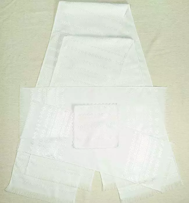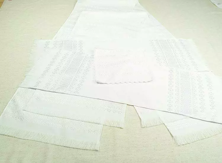 Білосніжні рушники і серветка з тканим орнаментом. Орнамент (Алатир) виконаний блискучими нитками, що надає цим весільним рушникам урочистості. Тканий орнамент поблизу виглядає як вишивка гладдю, а за ціною набагато доступніше.