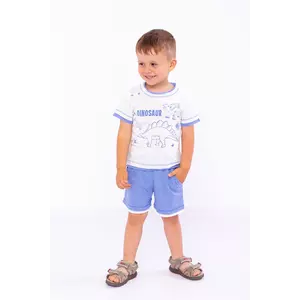 Співробітники компанії «Трикотажний Край» своєю продукцією сприяють тому, що турботливі батьки могли наповнити гардероб малюка максимально різноманітними, нестандартними і дуже зручними речами. Одна з таких пропозицій-комплект для хлопчика. У цей комплект входить оригінальна футболка з кумедним принтом, із смужками на рукавах, по горловині та по низу виробу, а також не менш симпатичні шортики з парою містких кишень. Модель призначена для носіння на свіжому повітрі в літню пору. Якість матеріалів бездоганна, бавовна відрізняється своїми натуральністю, приємлимістью для шкіри і хорошою стійкістю до зносу. Обидва предмета гардеробау можна носити і окремо: футболка чудово комбінується як зі світлими штанцями або шортиками, так і з більш темними речами, а шортики абсолютно самодостатні і будуть чудово виглядати на вашому хлопчикові.