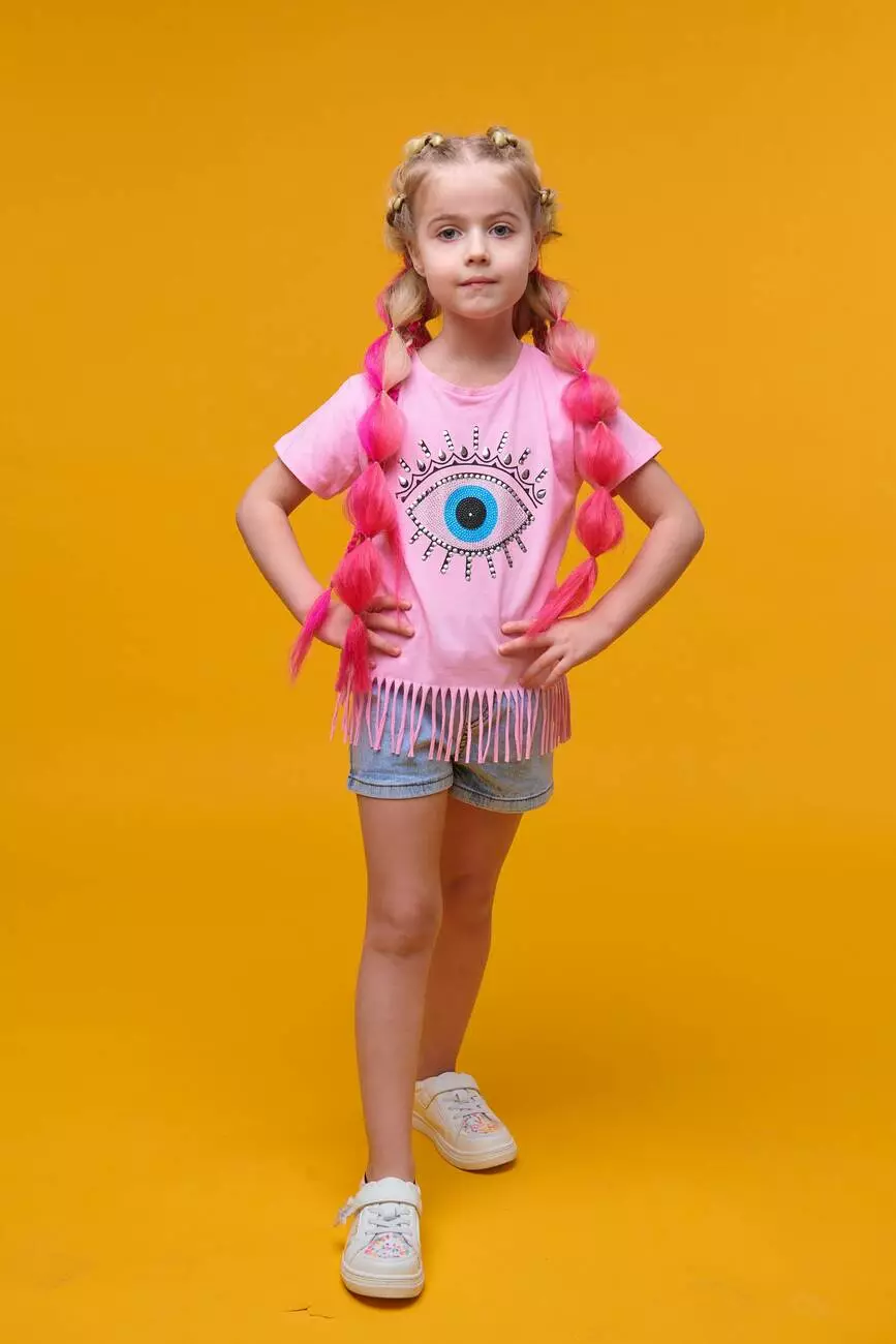Футболка: колір-рожевий. Прямий крій, короткий рукав. Кругла горловина. Гарний принт із стразів "Око". Знизу футболка прикрашена бахромою. Шорти: короткі шорти джинсові блакитного кольору. Пояс – резинка. Імітація ширинки. Попереду дві кишені-обманки. Дві накладні кишені ззаду. Розмірний ряд: від 104 до 164 см.Склад шорт: 98% бавовна, 2% лайкраСклад футболки: 70% бавовна, 25% поліестер, 5% лайкраРекомендації щодо догляду: машинне прання при температурі 30 градусів*Відтінок кольору на фотографії може відрізнятися від реального]]>