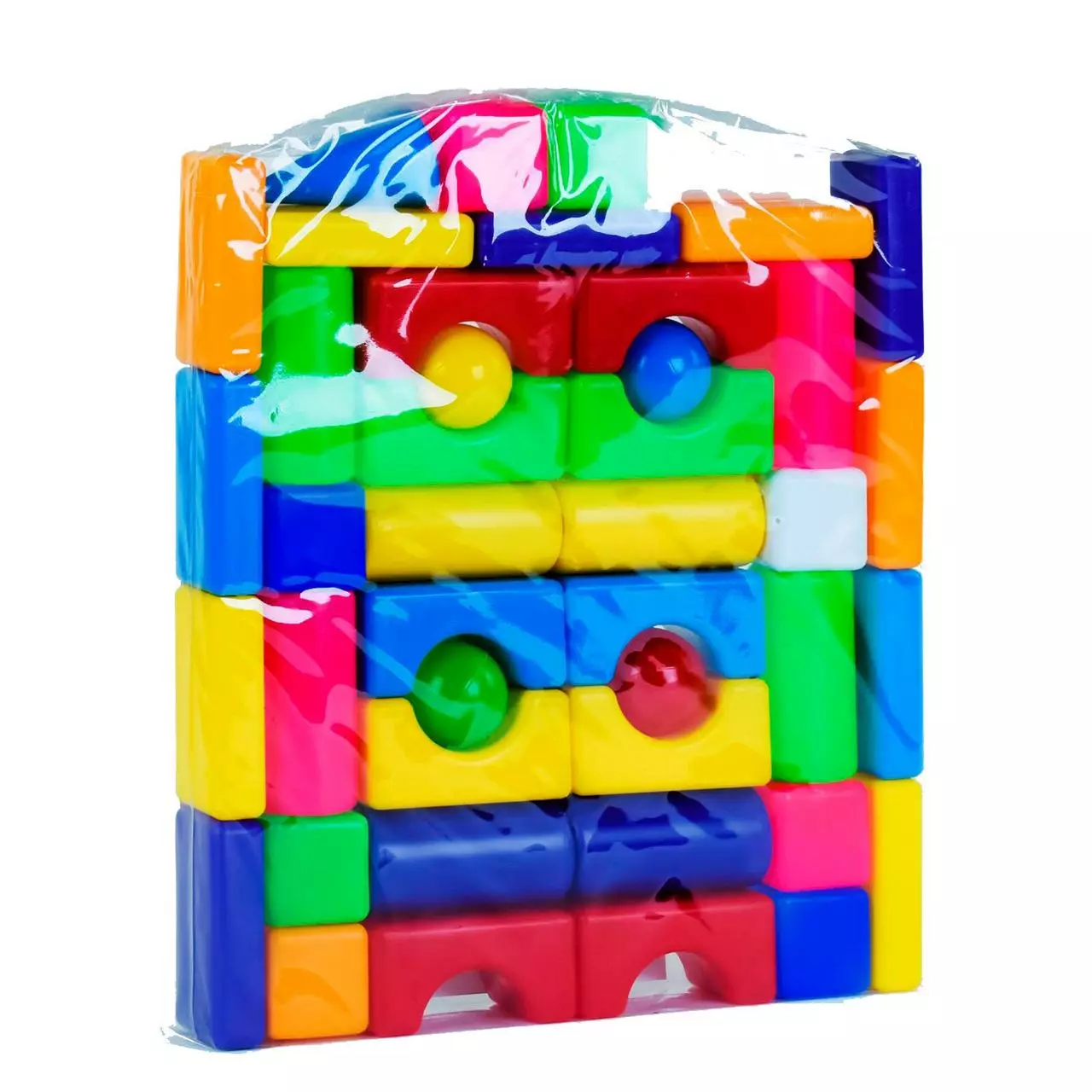 Кубики выполнены из пластмассы и имеют различную форму и цвет, что