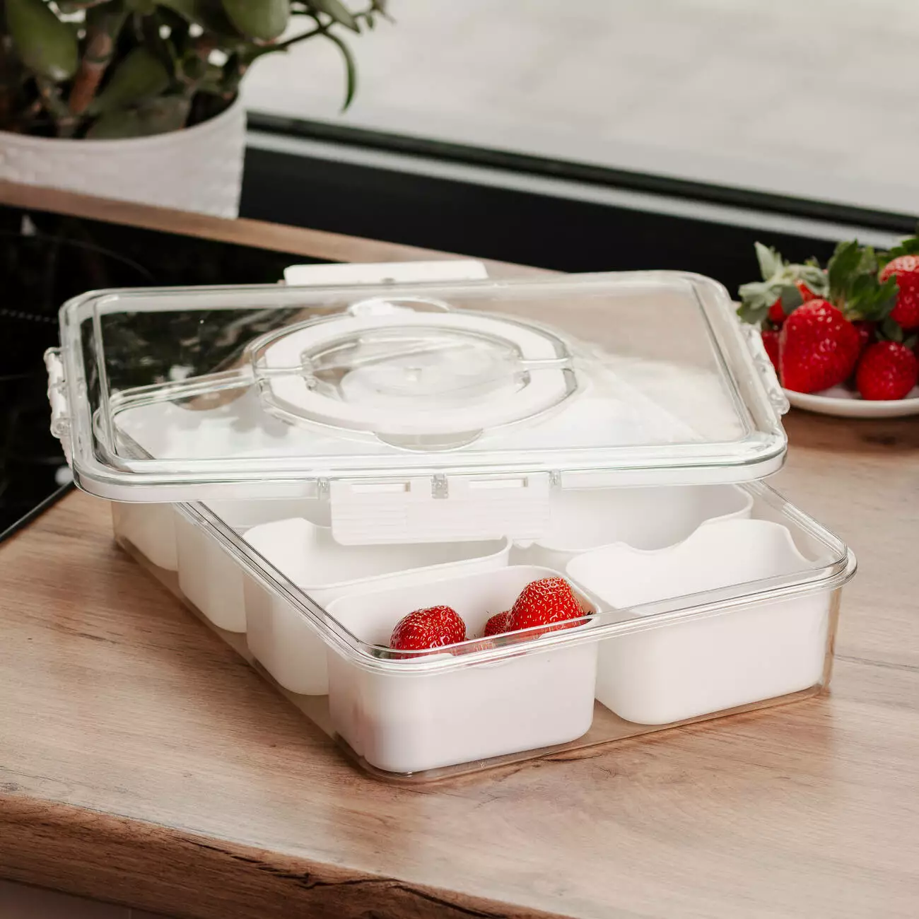 Завдяки прозорим стінкам легко контролювати вміст, а рівна форма дозволяє ефективно використовувати простір у холодильнику. Контейнер легко миється, підходить для багаторазового використання, а наявність знімних відсіків робить догляд ще зручнішим.