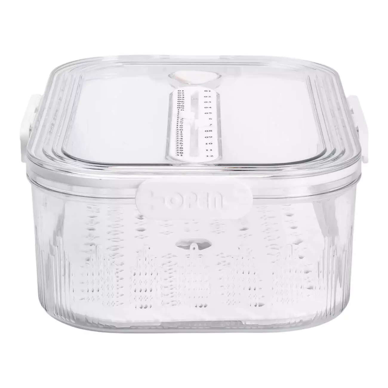 На дні контейнера розміщена знімна дренажна підставка, яка відокремлює продукти від зайвої вологи, захищаючи їх від передчасного псування. Така конструкція особливо зручна для зберігання ягід, зелені або промитих овочів. На кришці передбачено рельєфну шкалу, що виконує функцію вимірювального індикатора — її можна використовувати для оцінки висоти продуктів.