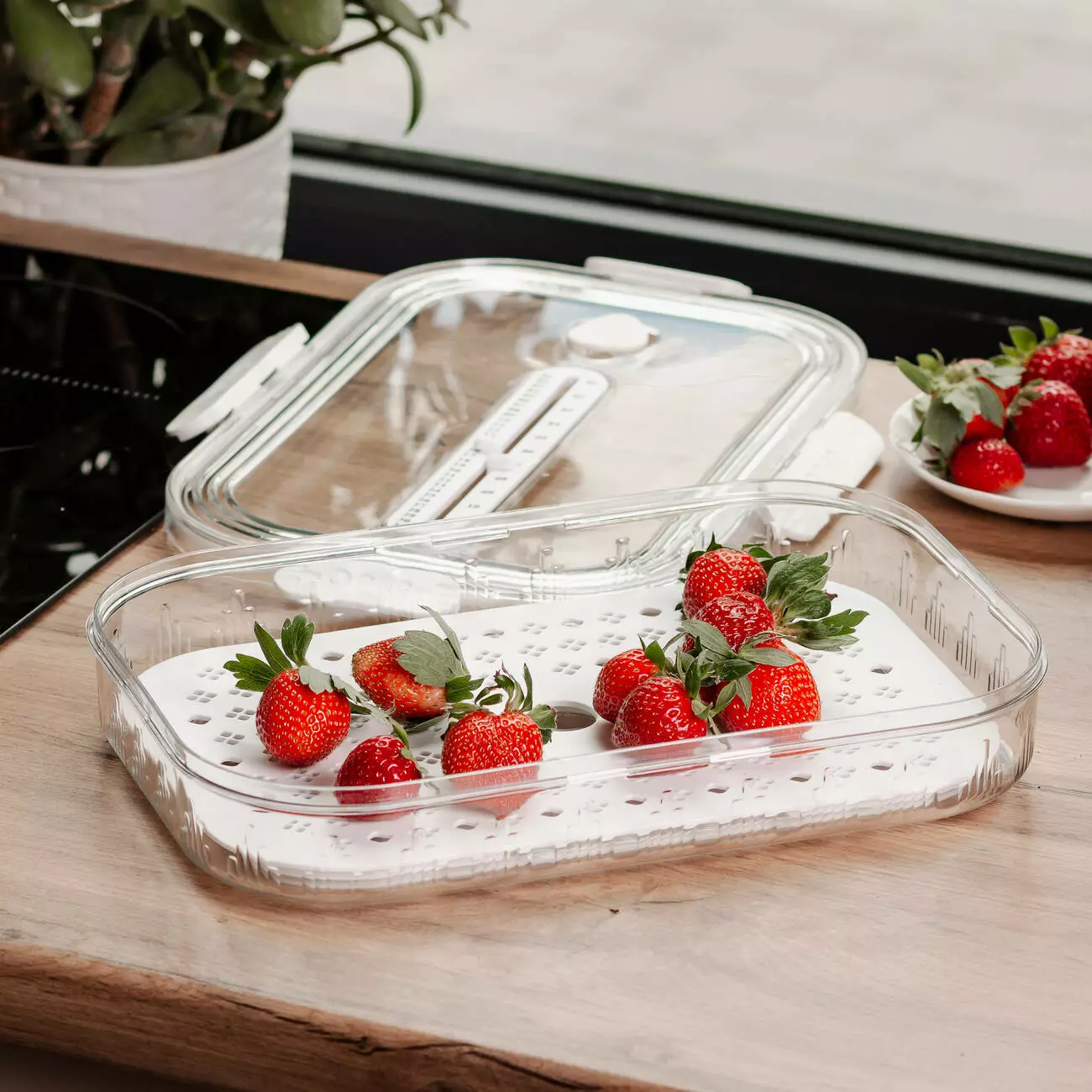 Контейнер підходить для щоденного використання вдома або під час транспортування продуктів. Він простий у догляді: легко миється вручну або в посудомийній машині, а дренажна решітка знімається для зручного очищення. Міцний пластик не вбирає запахів і забезпечує багаторазове використання.