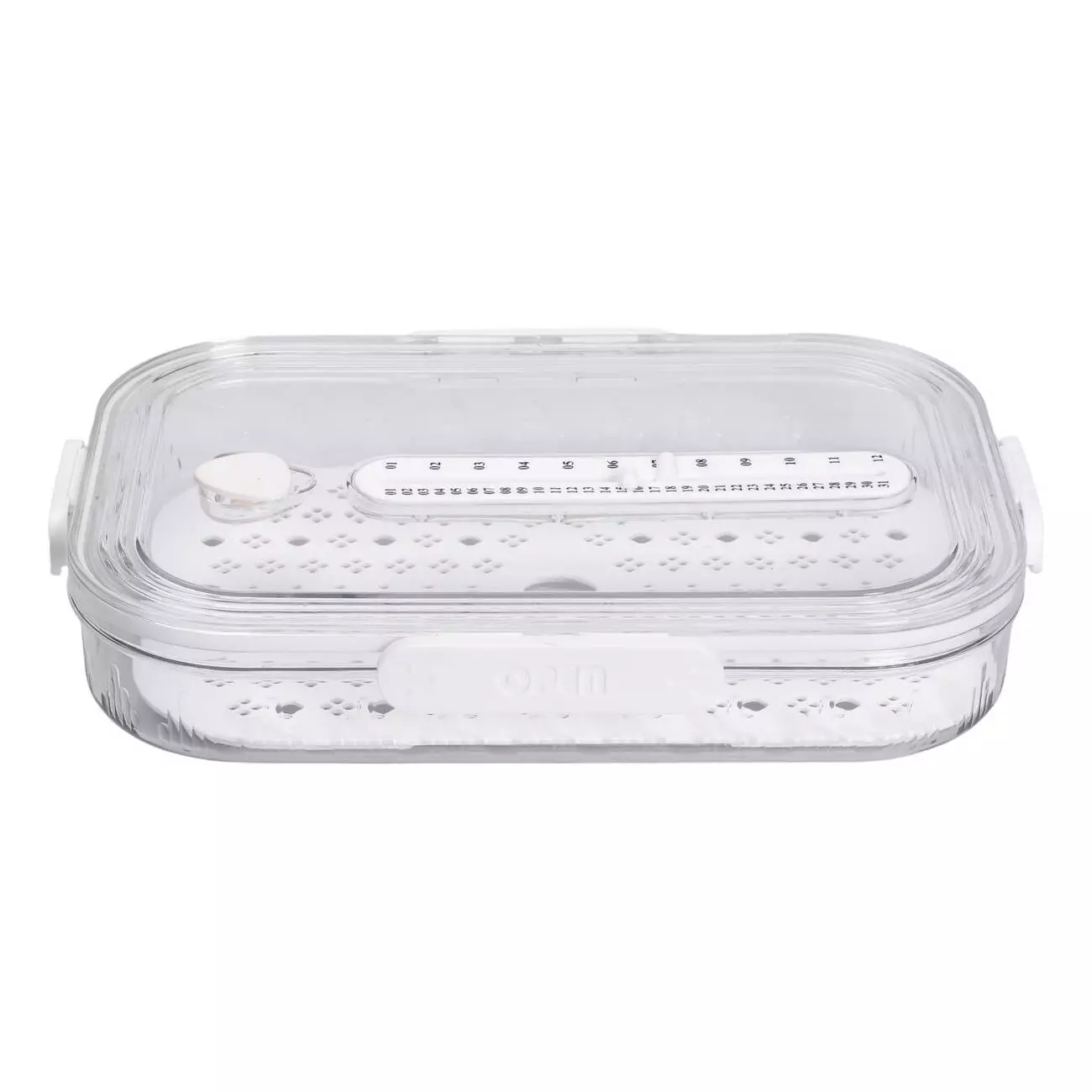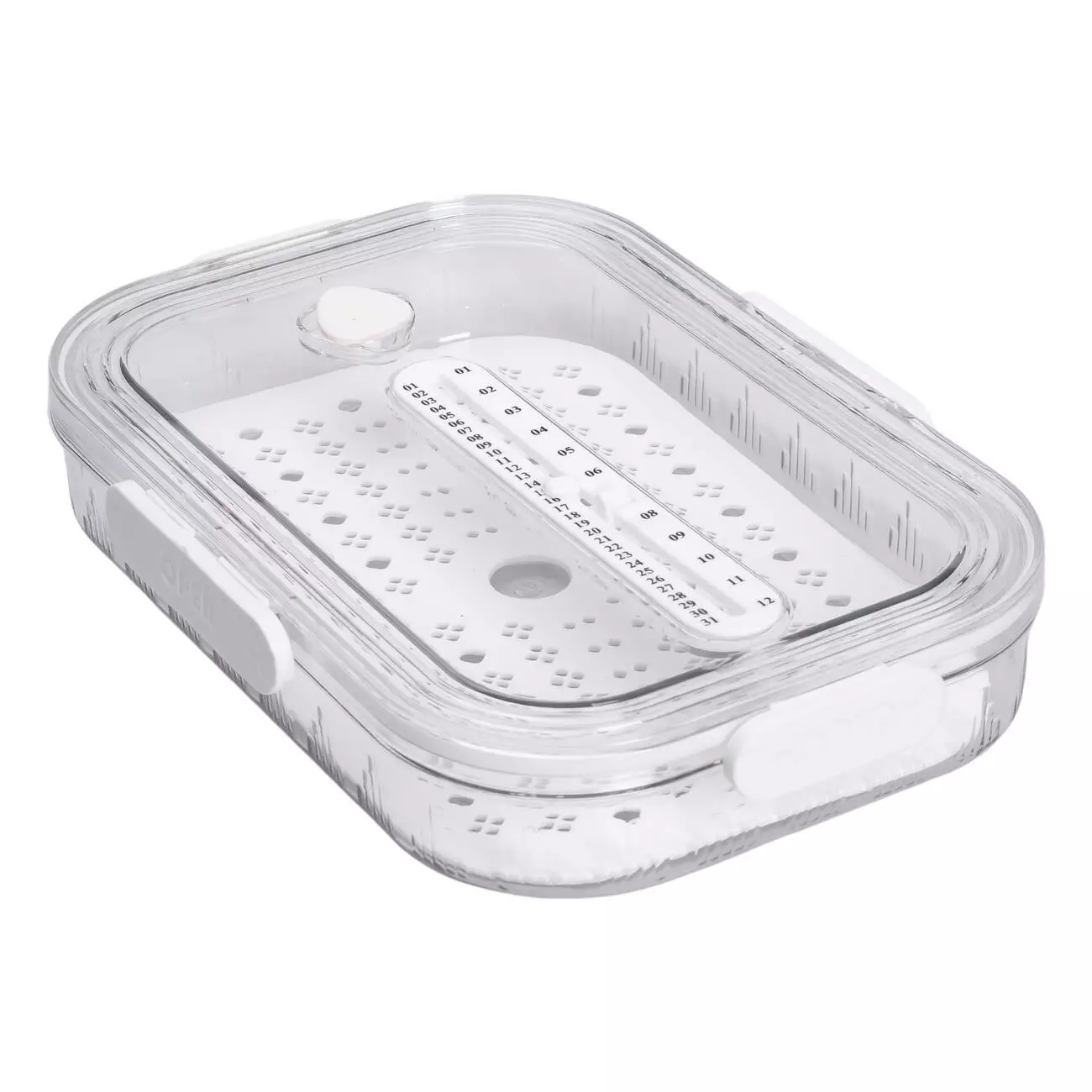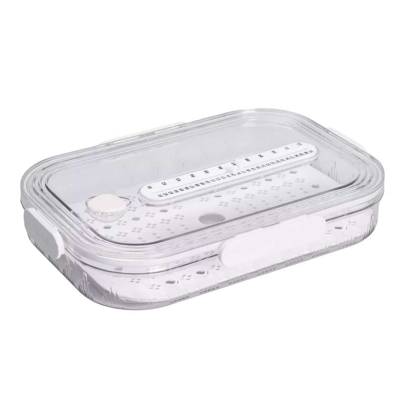 На дні контейнера розміщена дренажна підставка, яка створює простір для відведення зайвої вологи — це особливо зручно при зберіганні промитих овочів або ягід. На кришці присутня рельєфна шкала, що нагадує лінійку — її можна використовувати як вимірювальний індикатор висоти продуктів. Конструкція контейнера забезпечує ефективне зберігання в холодильнику, а його розміри дозволяють компактно розміщувати вміст.
