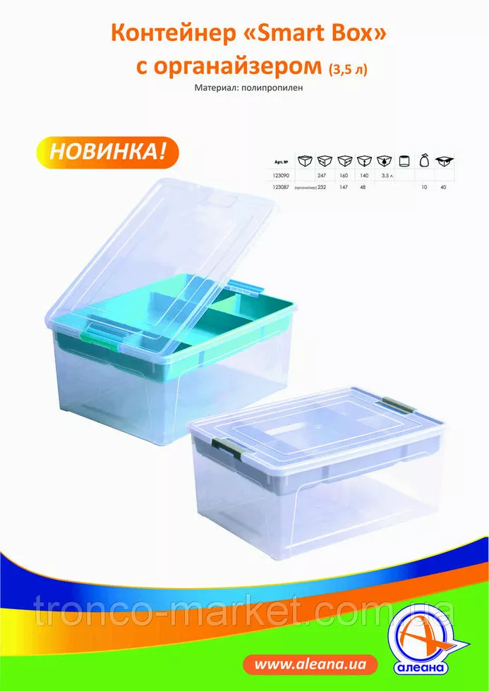Новинка от украинского производителя АЛЕАНА - умные коробочки для хранения различных предметов на любой вкус. Разработан с целью помочь вам грамотно организовать хранение вещей в вашем доме. ?зготовлен из качественного полипропилена, удобный и вместительный. В нем можно хранить хранить ювелирные украшения, косметику и другие необходимые вещи. Оптимально подобранные объемы смартбоксов удивят вас своим разнообразием : 0,175 л ; 0,375 л; 0,4 л; 0,8л; 1,7 л; 3,5л ; 3,8л ; 7,9 л; 14л ;27л; 40 л . Линейка смартбоксов предлагает три вида контейнеров : простые прозрачные смартбоксы, прозрачные смартбоксы с органайзером, цветные смартбоксы спринг. Все они имеют ровную правильную форму, которая максимально позволит съэкономить пространство, имеют крепкие зажимы для надежного хранения.Правильно организованное хранение,при этом еще и радущее глаз гарантирует порядок в доме и в мыслях. Проверьте на себе! :)