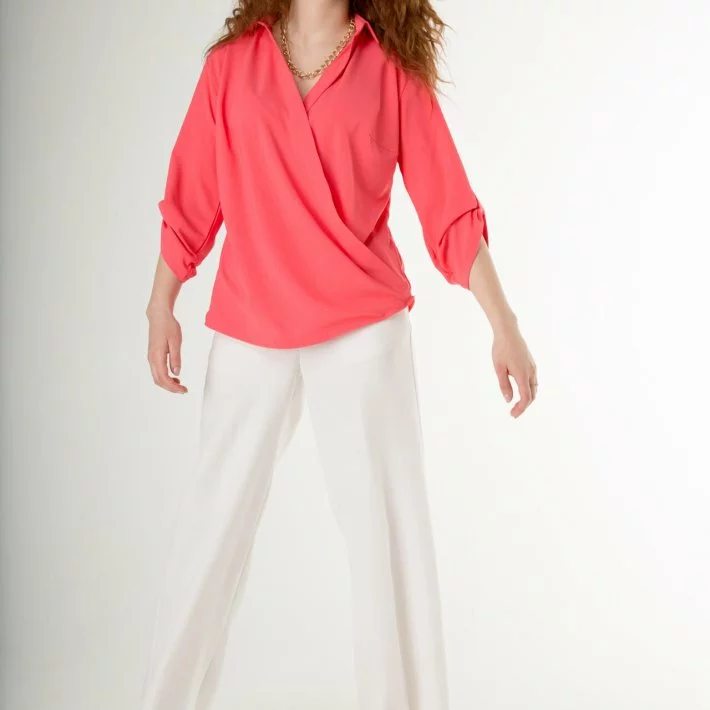 Блузка з глибоким запахом, коміром-стійкою по горловині і рукавом