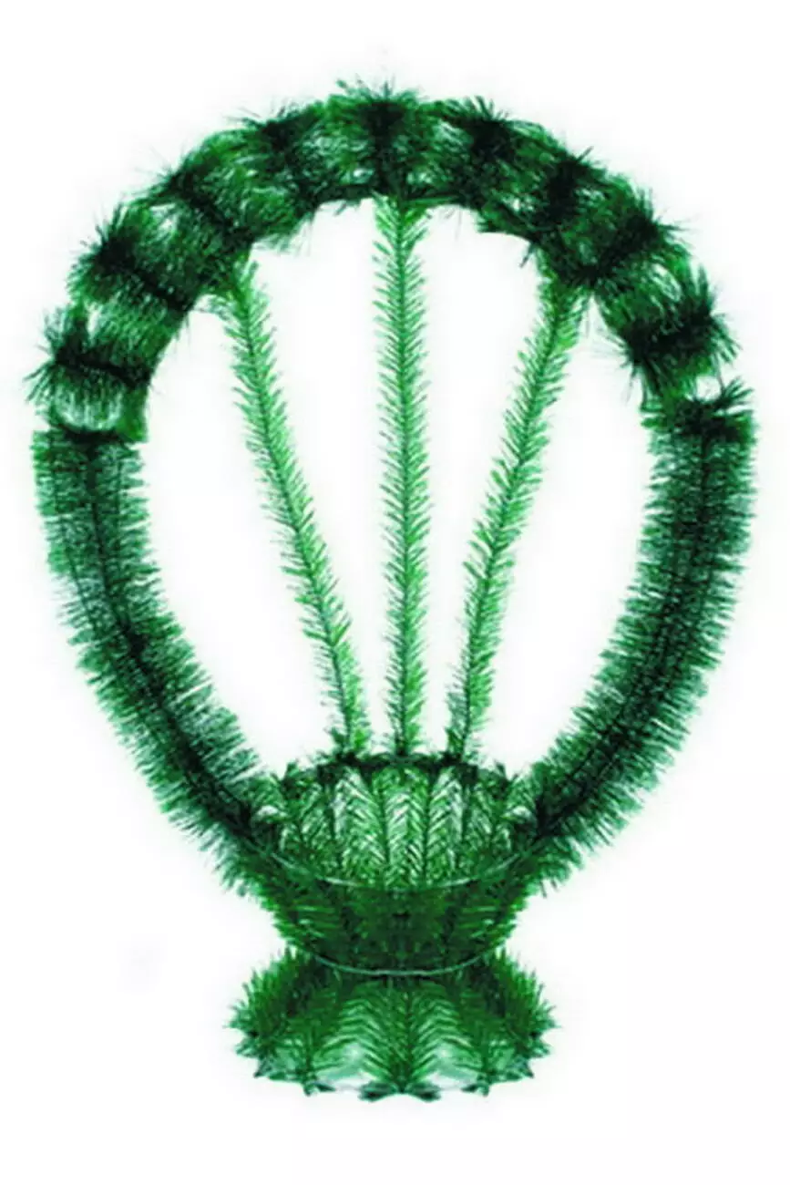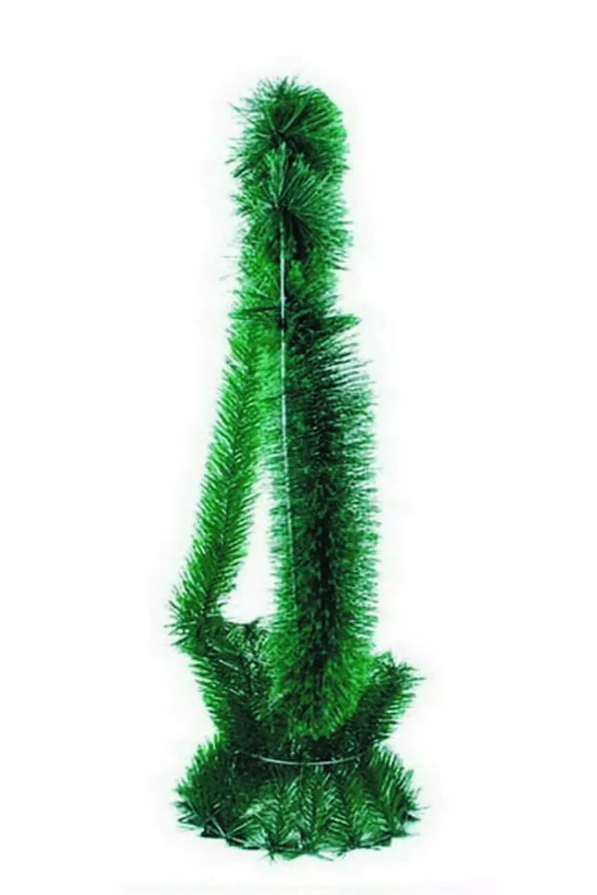 Кошик косий зі штучної хвої з широкою подвійною ручкою з йорша. Ручка з'єднується з вазою хвойними відрізками, розмір 85*62*23 см.