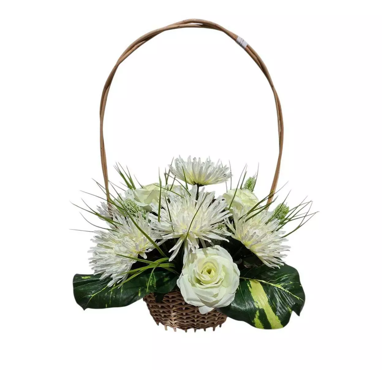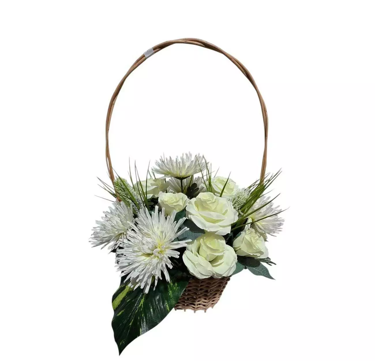 Ритуальний кошик із лози розміром 55*40*35 см. Кошик прикрашений букетом айстри та троянди, гілками евкаліпту, дифенбахії та оазисом.