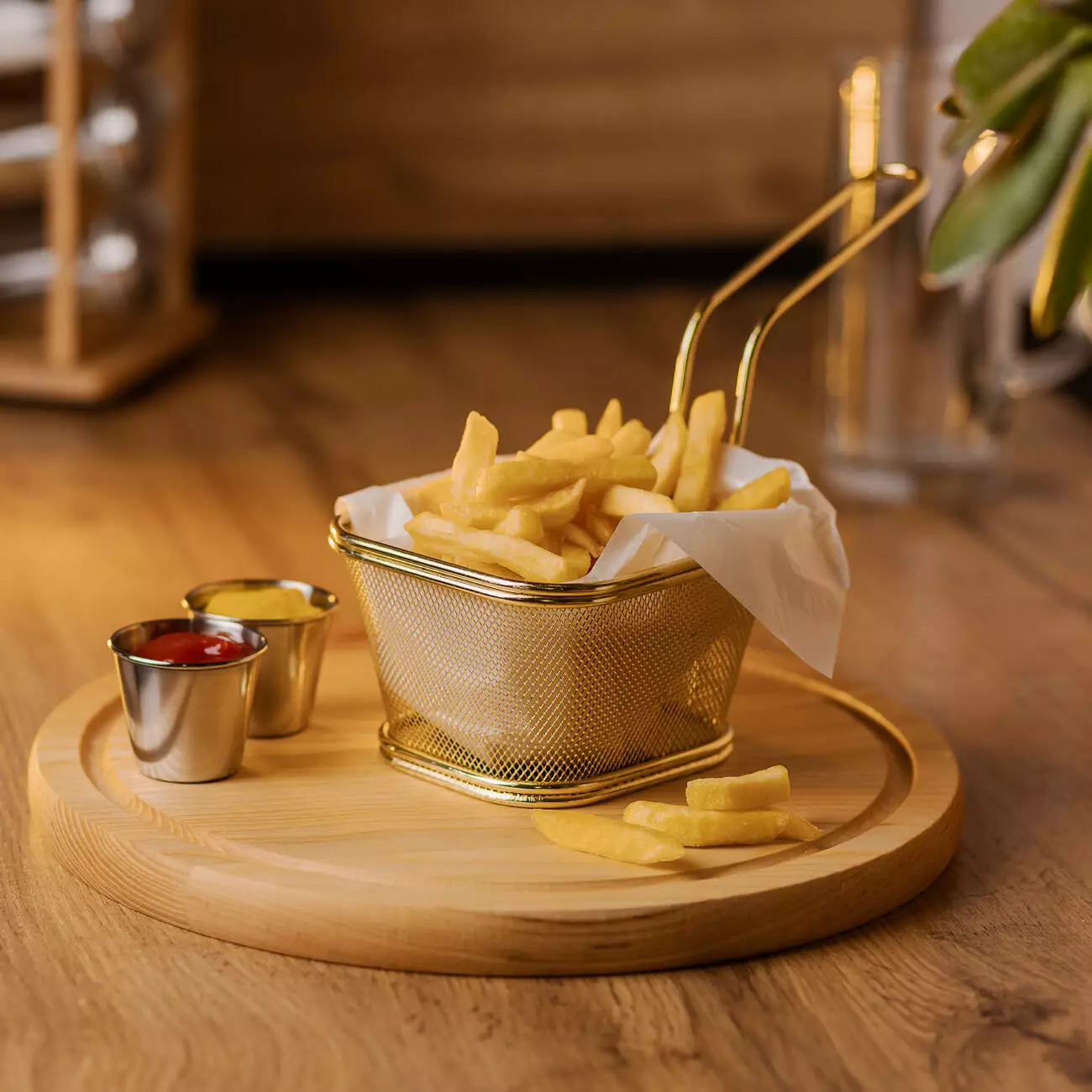 Сервірувальний кошик - практичний аксесуар для подачі гарнірів і закусок. Він ідеально підходить для картоплі фрі, курки, цибулевих кілець, креветок та інших страв, приготованих у фритюрі. Завдяки своїй конструкції кошик забезпечує зручну та ефектну подачу страв.