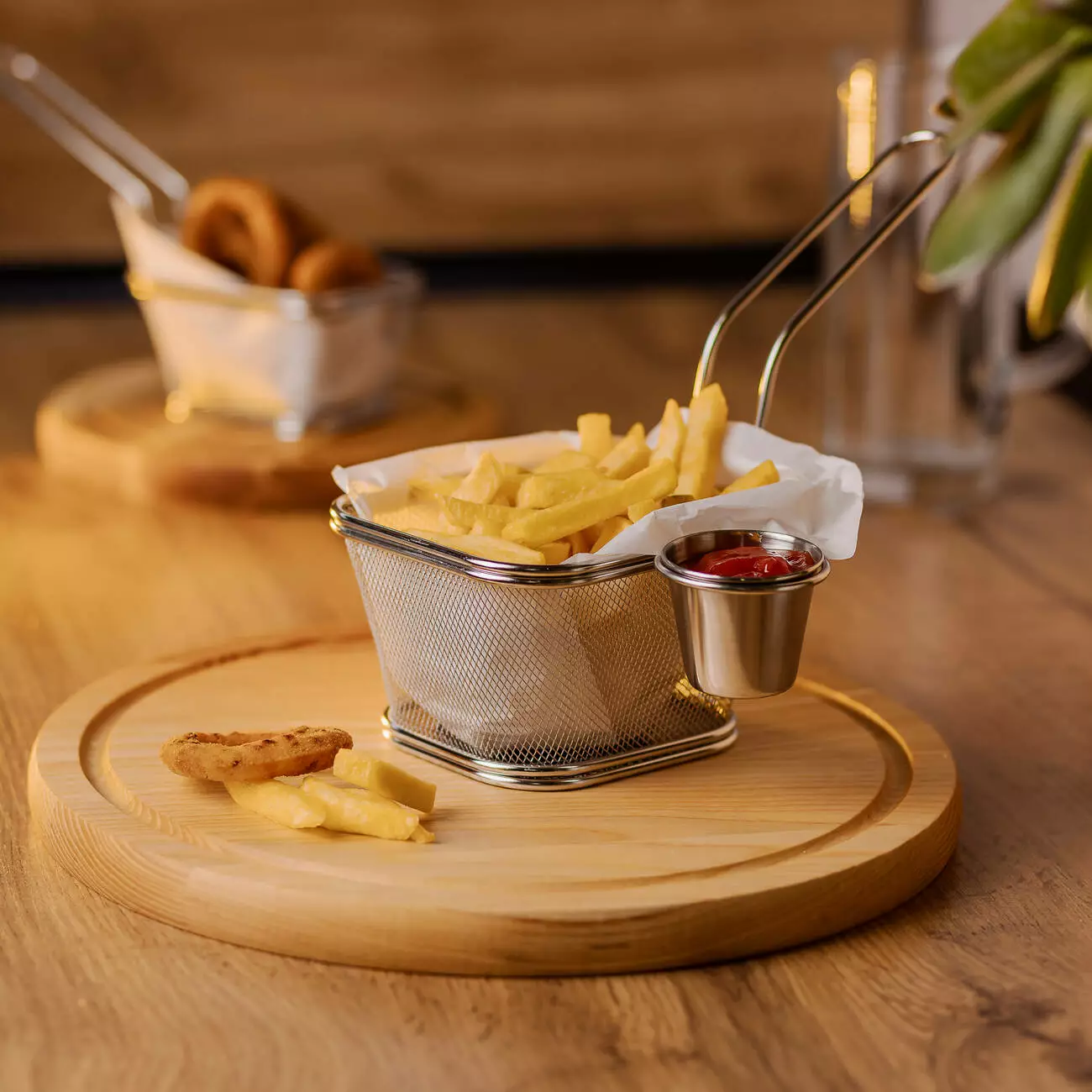 Сервірувальний кошик - зручний аксесуар для подачі гарнірів і закусок. Він ідеально підходить для картоплі фрі, курячих наггетсів, цибулевих кілець, креветок та інших страв, приготованих у фритюрі. У комплект входить соусник, що дає змогу подавати сметану, вершки, густі соуси або доповнювати страви оливками та іншими добавками.