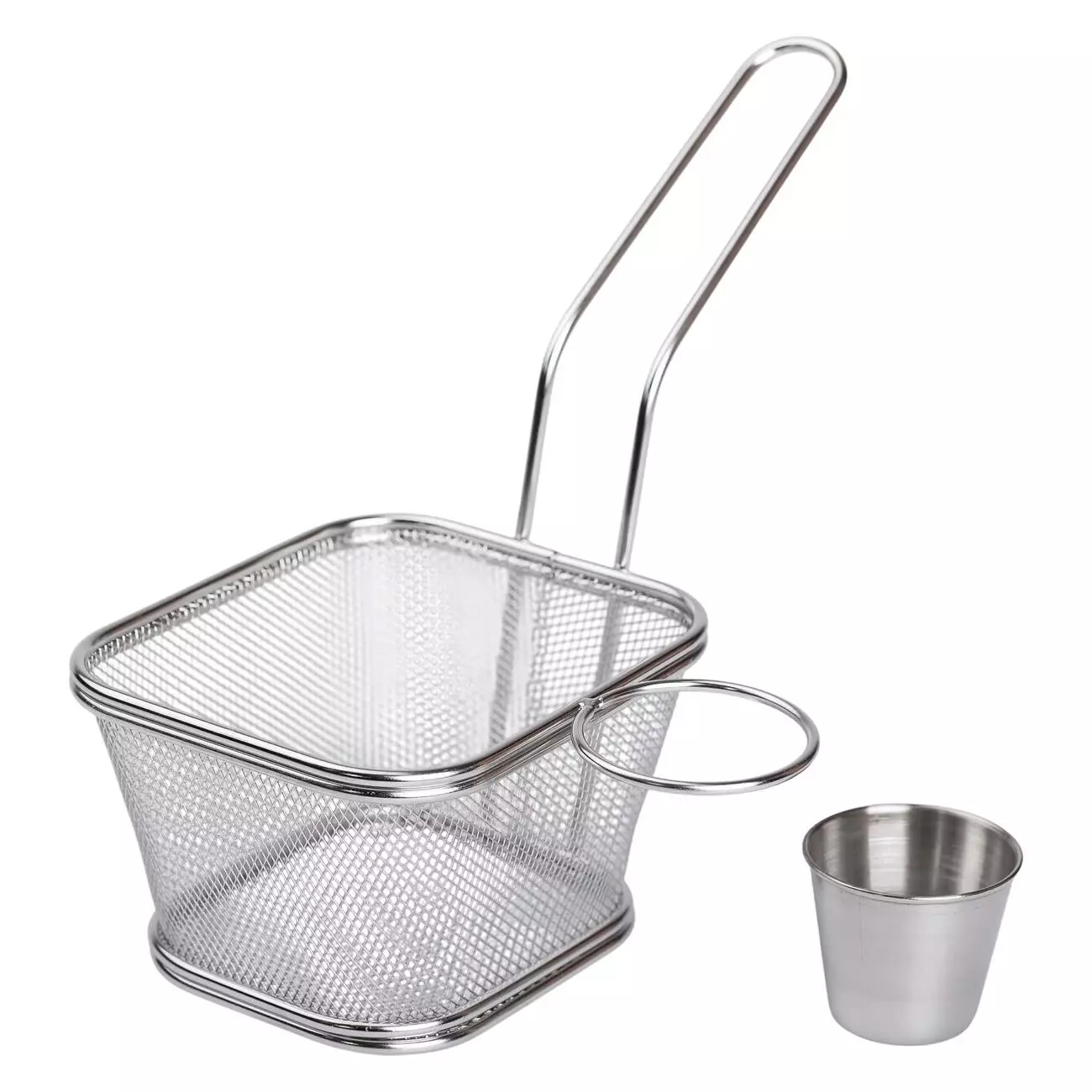 Кошик виготовлено з нержавіючої сталі, яка не вступає в реакцію з продуктами, має міцну конструкцію і зручну ручку. Його можна мити вручну або в посудомийній машині, а компактні розміри полегшують зберігання.