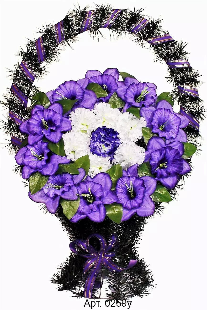 прикрашений головами нарцису, гвоздики та ритуальною стрічкою.