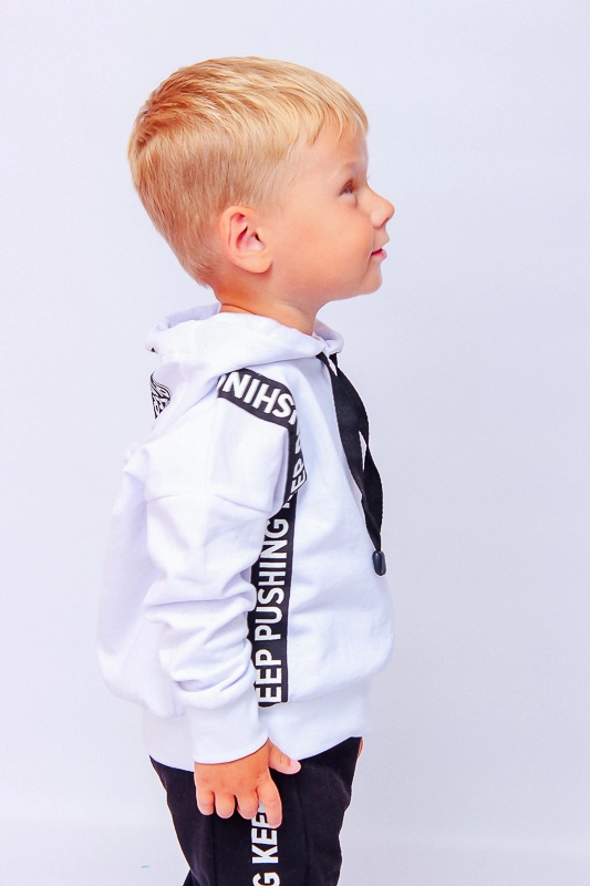 У гардеробі кожної дитини має бути багато спортивного одягу. Такі речі ідеально підходять для повсякденних ігор, прогулянок, занять спортом. У них тепло і комфортно. Представлений костюм виконаний з однотонного начісу. Полотно сідає при пранні по довжині на 1-2 см. Рекомендується прати при температурі не більше 30 градусів. Штанці виконані в чорному кольорі. З боків є стильний напис. Штани доповнені кишенями для зручності. Кофта пошита в декількох кольорах, з капюшоном, і доповнена стильними написами, виконаними за допомогою накату. Вашому синочку такий костюм буде до лиця.
