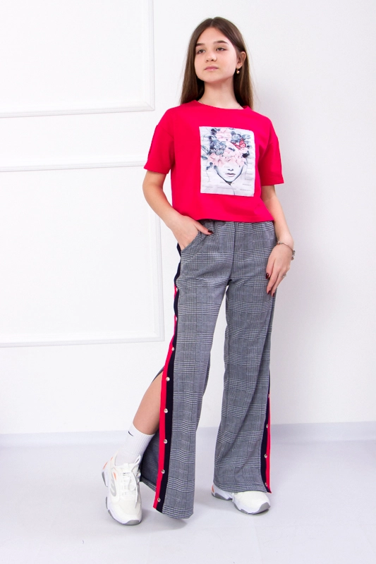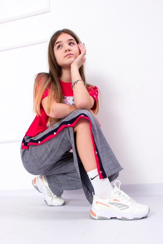 Костюм для дівчинки від ТМ "Трикотажний Край" - відмінний вибір і для любительок стилю «тотал лук», і для прихильниць несподіваних кольорових поєднань в одязі. Не залишить байдужим справжніх цінителів дизайну і стилю. У цьому одязі юна леді не залишиться непоміченою, куди б ви не прийшли. Штани вільного крою зверху приталені, до низу рівні, на талії фіксуються за допомогою еластичного пояса-резинки. Декоровані яскравими лампасами, що створюють цікавий контраст. Укорочена футболка вільного крою по рукаву декорована кнопкою, відмінна особливість цієї футболки - нашивка по переду робить виріб ще більш стильним. Приємним плюсом для батьків стане той факт, що костюм пошитий з якісного полотна двунитка.