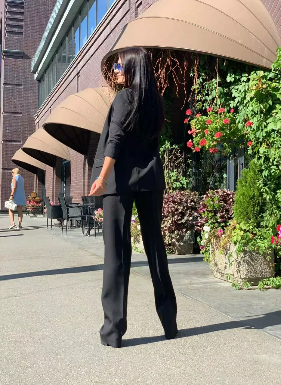 Стильний класичний костюм з тендовими штанами-трубами високої посадки та дуже ефектним піджаком з рукавами 3/4