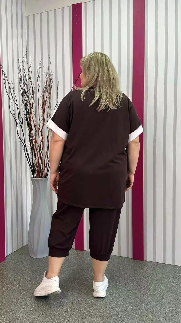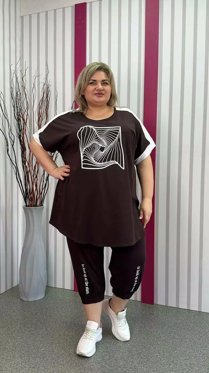 капрієвий костюм з вільною футболкою з турецького трикотажу кулір пенье супрем з дуже гарною розтяжністю м'яка, приємна до тіла. Костюм прикрашений якісним накатом та камінням.