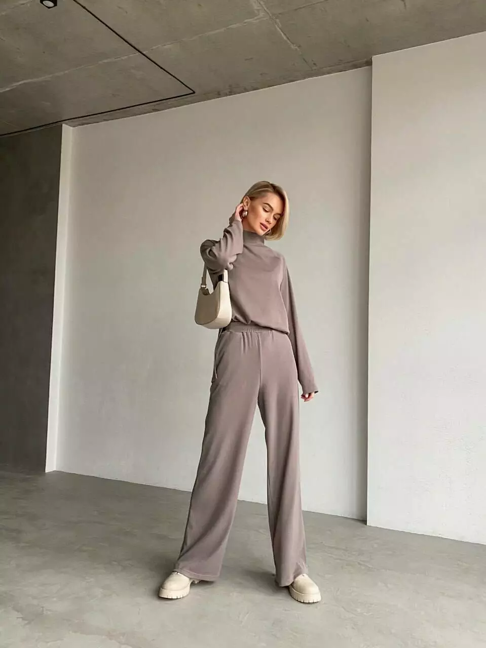 Виріб має пояс в тон, штани високої посадки та прямого крою на еластичній гумці, кофта з горлом, широка, з двома розрізами з боків