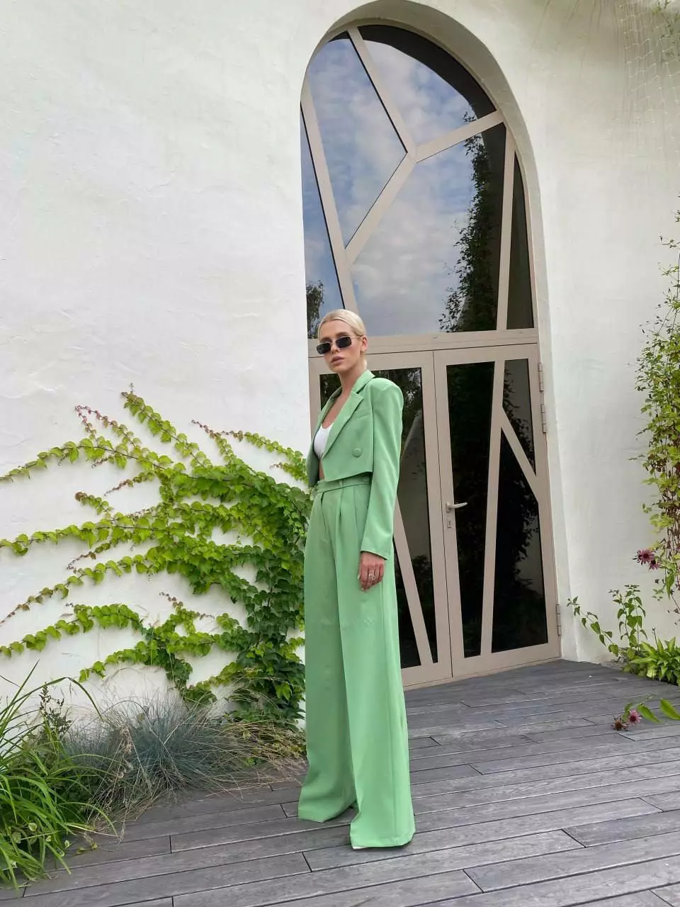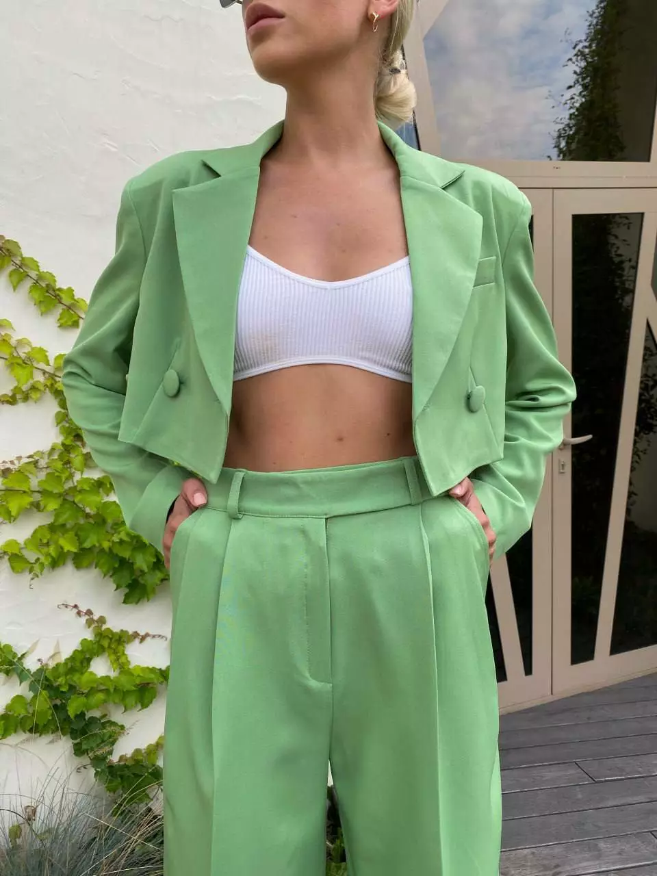 У люксовому виконанні Кроп-жакет двобортний та штани палаццо