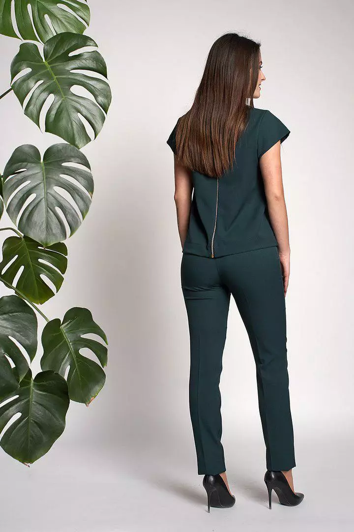 Стильный и современный костюм Нейл состоит из кофточки и брюк, выполнен из ткани креп-костюмка высокого качества. Кофточка прямого кроя с коротким рукавом, сзади по всей длине застегивается на золотистую молнию. Укороченные модные брючки со стрелкой, с высокой посадкой застегиваются на пуговицу и молнию. Такие брюки делают Вашу фигуру очень женственной, подчеркивают узкую талию и округлую линию бедер. Костюм очень модный и практичный.