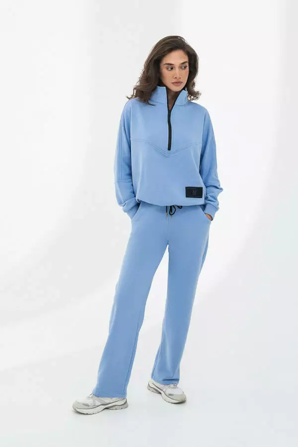 Штани та анорак небесно блакитного кольору доступні в у всіх розмірах для замовлення. Костюм теплий і комфортний, вільного крою. Тканина трикотаж, склад 70% бавовна, 30% поліестер. Широкий ворот з сріблястою блискавкою зробить ваш аутфіт дуже гарним і стильним. Штани супер комфортні, вільні з двома кишенями та резинками біля гомілки, за допомогою якої створюється крутий обʼємний образ. Натуральна тканина відводить зайву вологу та добре утримує тепло, пропускає повітря. Ще один плюс цього костюму, що він не кошлатиться і не линяє. Цей блакитний костюм з регланом ідеальний ніжний базовий варіант, але також можно носити його, як разом так і поєднувати з іншими елементами вашого гардеробу. З цією моделью ви завжди будете виглядати стильно, ніжно і різноманітно.